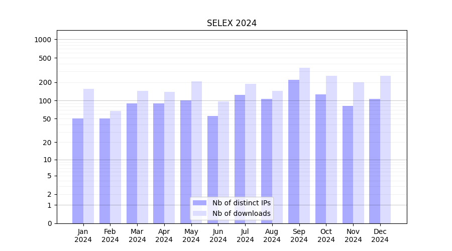 Number of downloads for software package SELEX, year by year, from 2025 back to 2014 (years with no downloads are omitted):