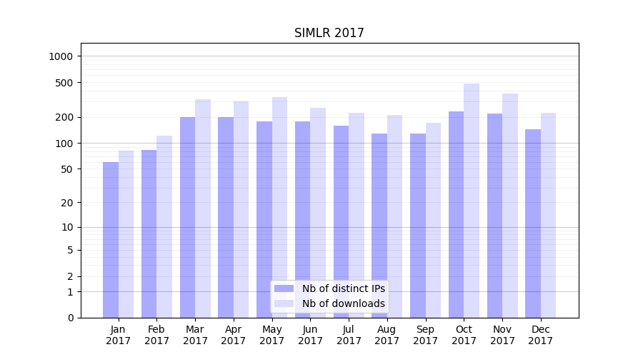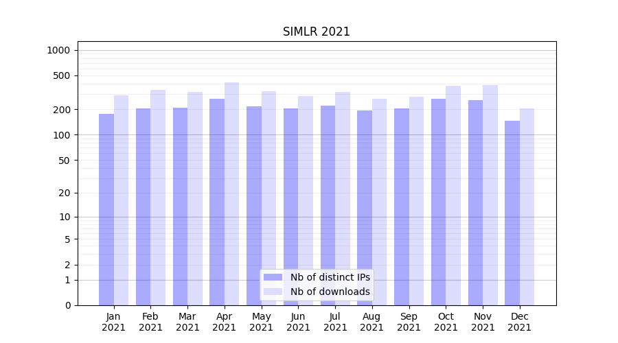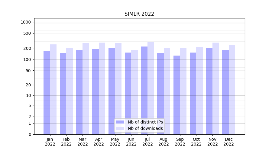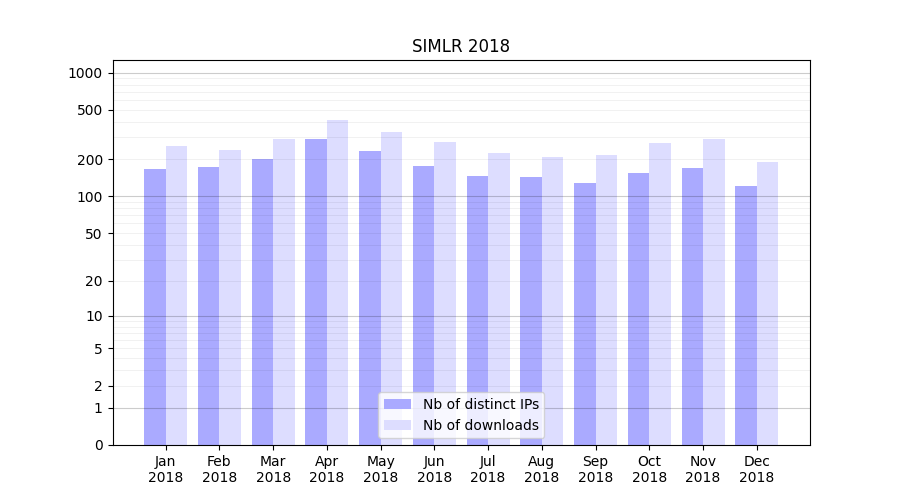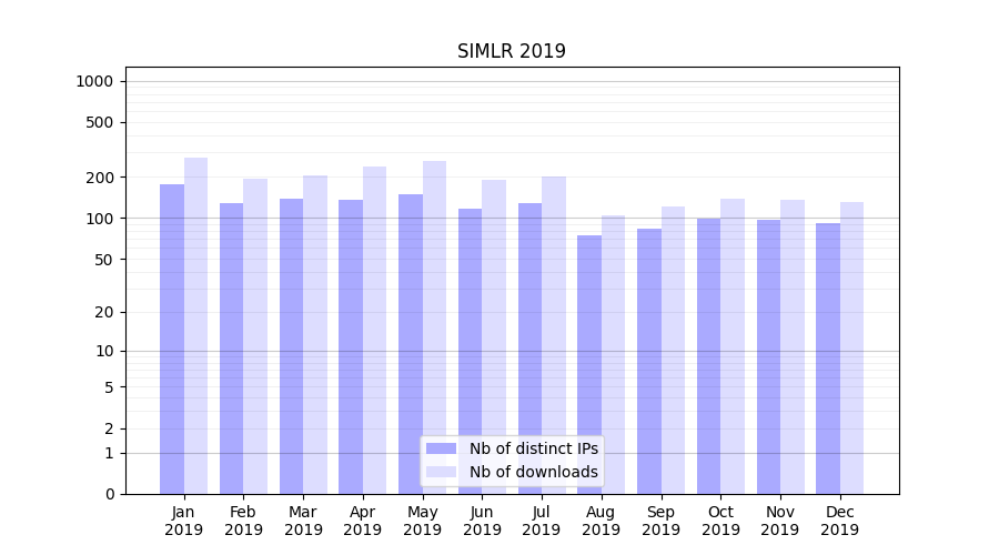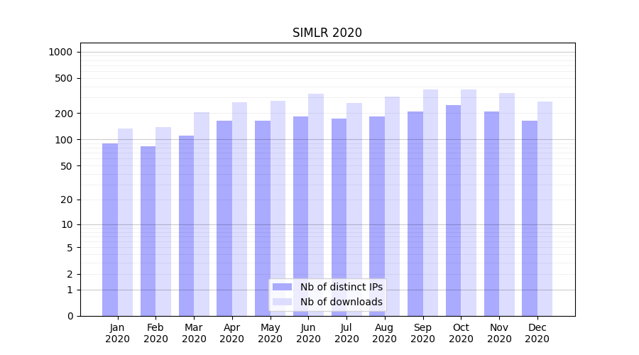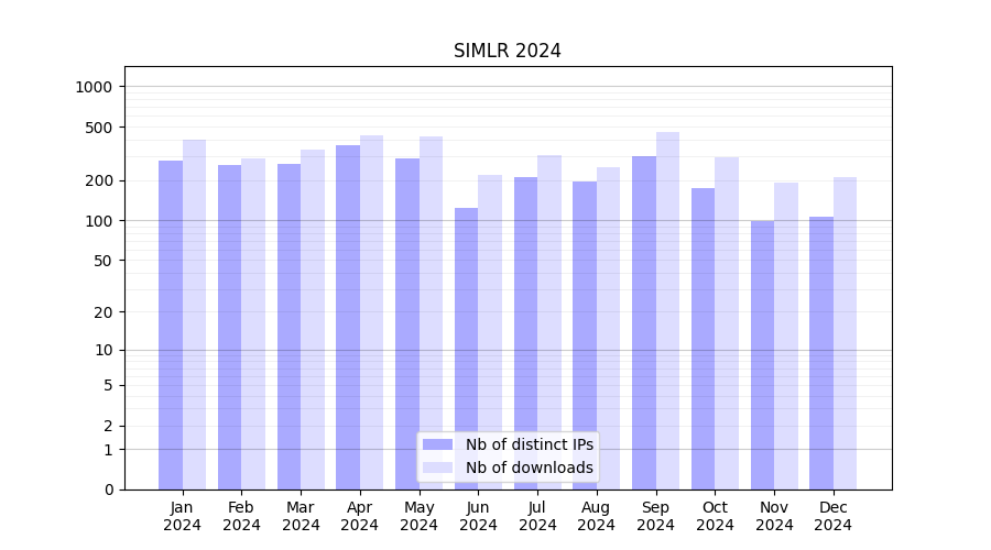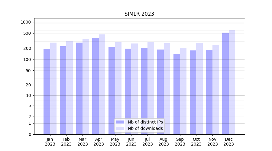 Number of downloads for software package SIMLR, year by year, from 2025 back to 2014 (years with no downloads are omitted):