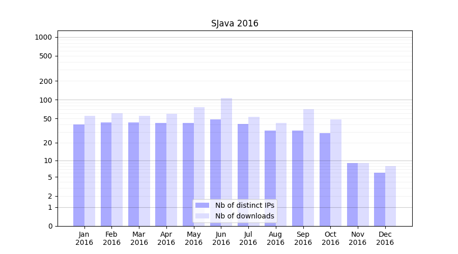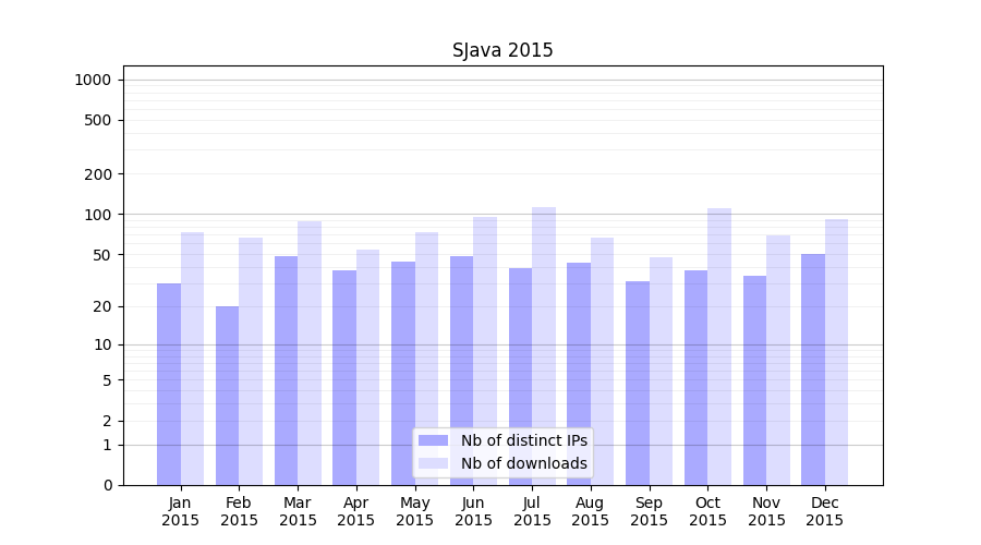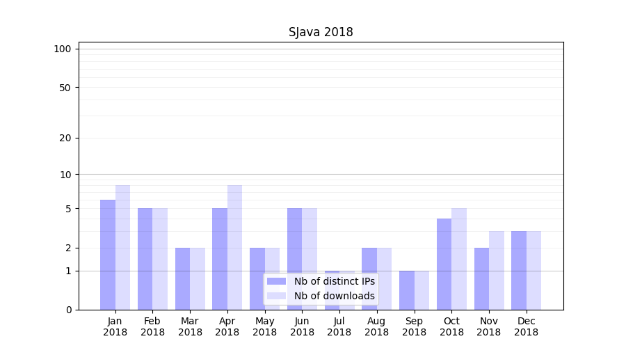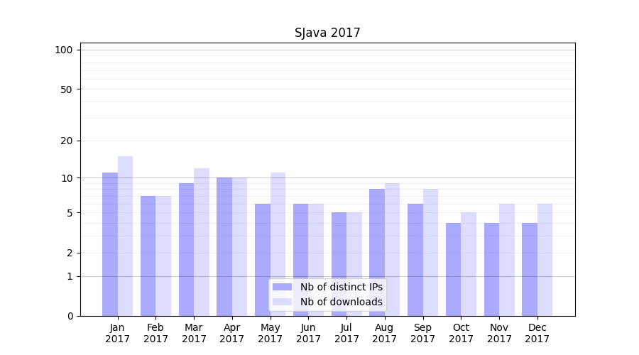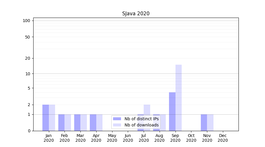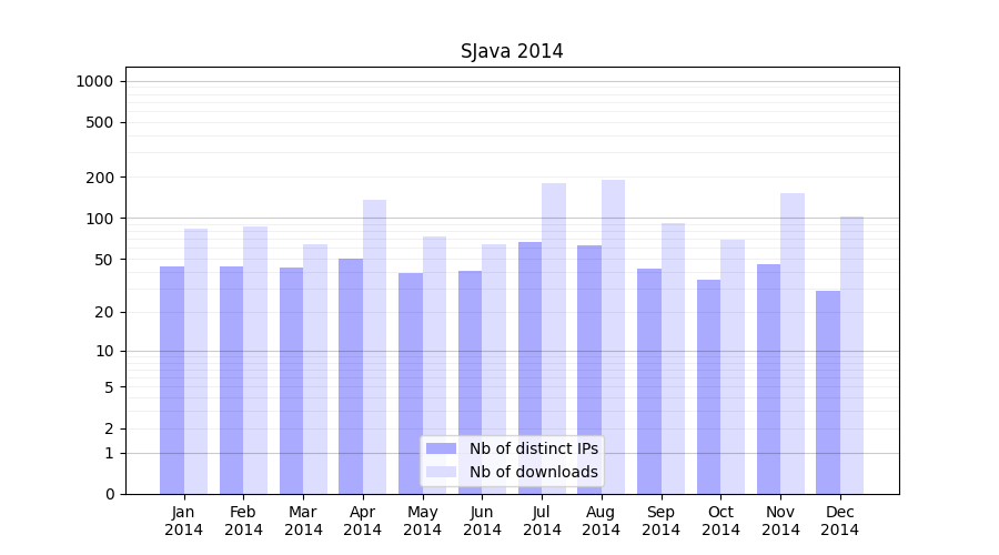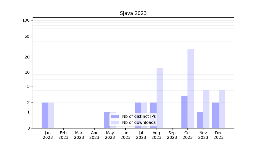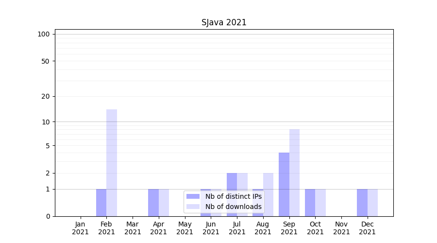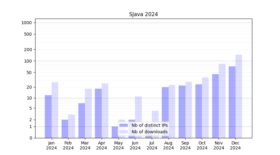 Number of downloads for software package SJava, year by year, from 2025 back to 2014 (years with no downloads are omitted):