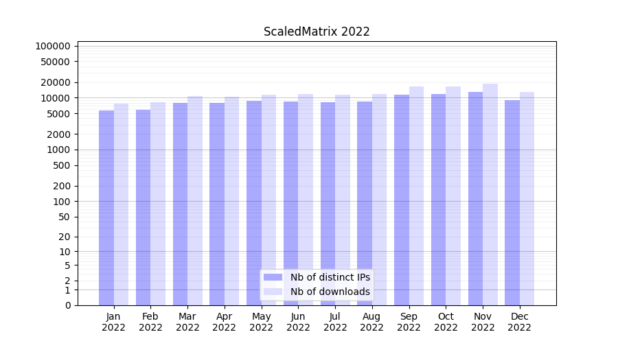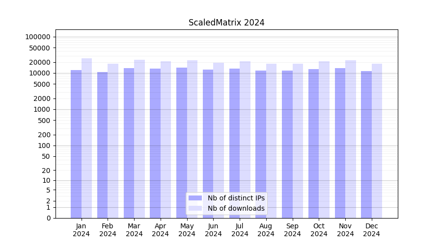 Number of downloads for software package ScaledMatrix, year by year, from 2025 back to 2014 (years with no downloads are omitted):