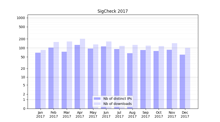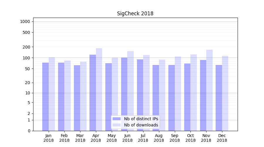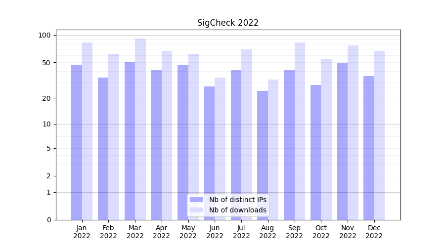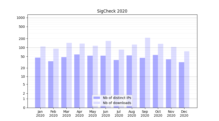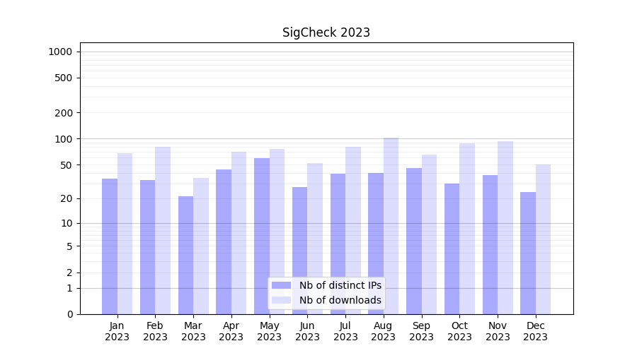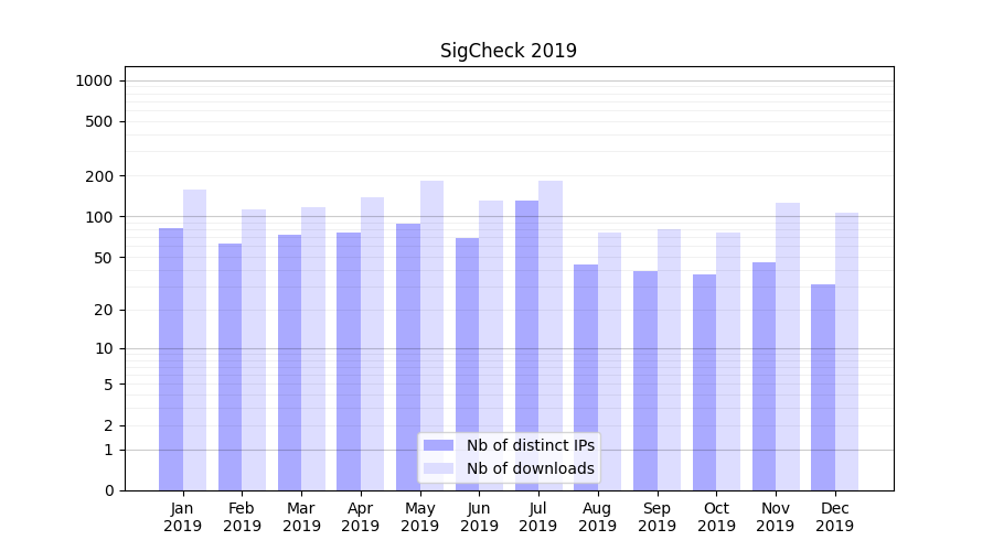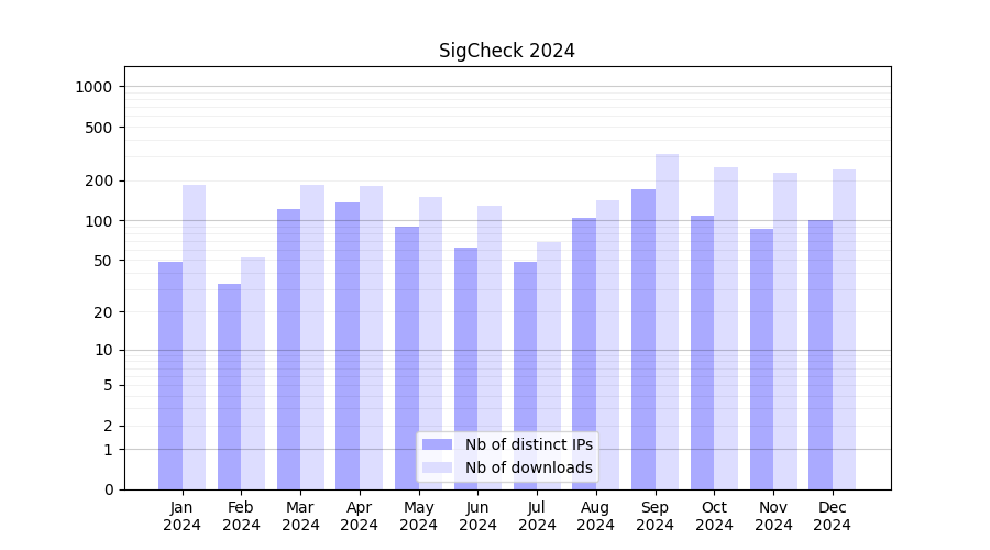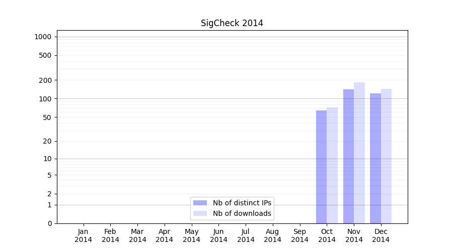 Number of downloads for software package SigCheck, year by year, from 2025 back to 2014 (years with no downloads are omitted):