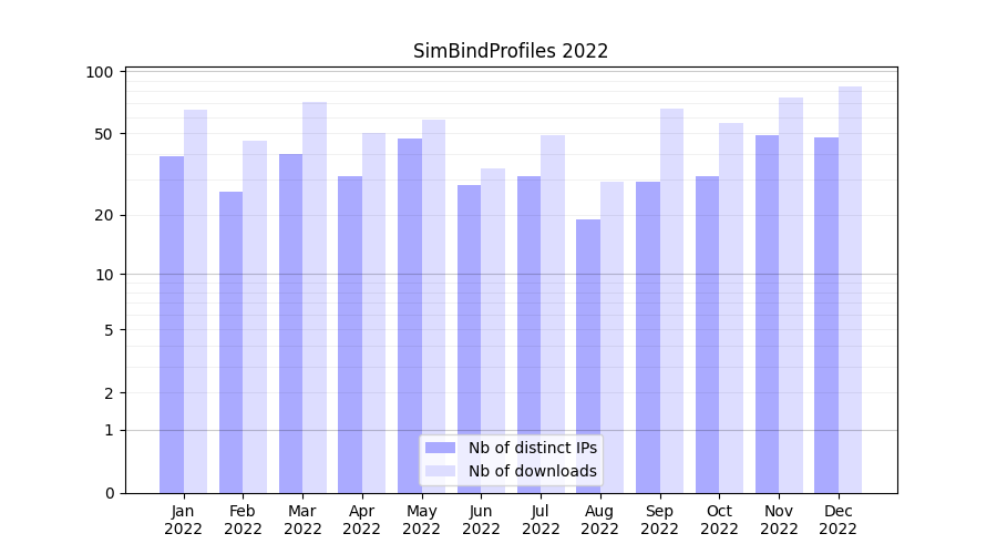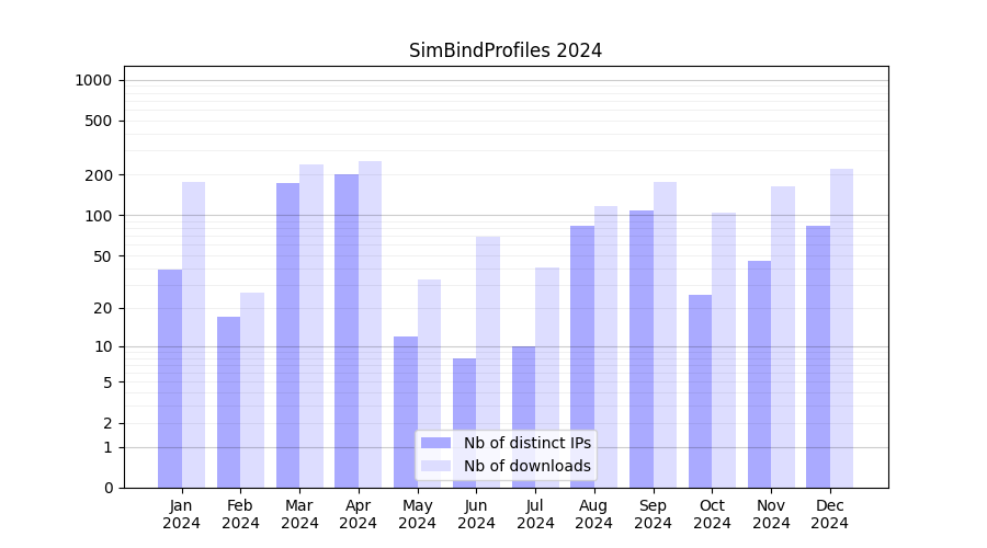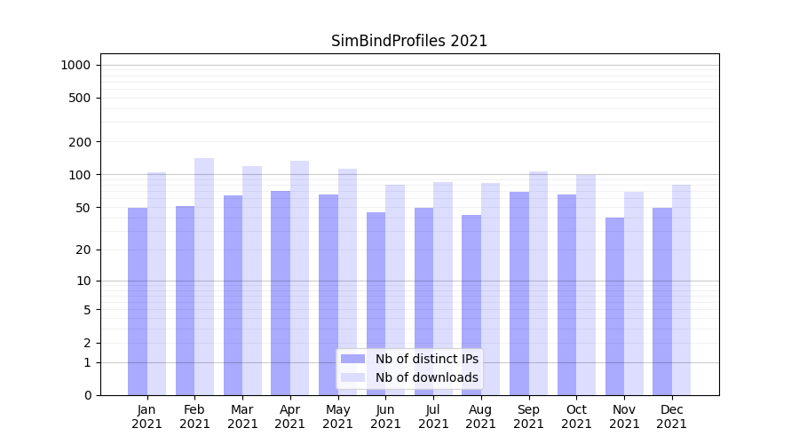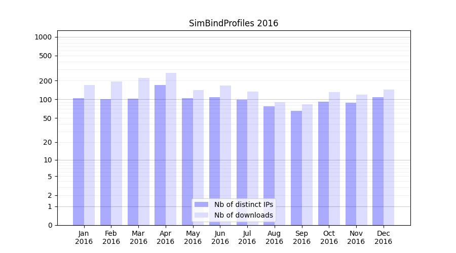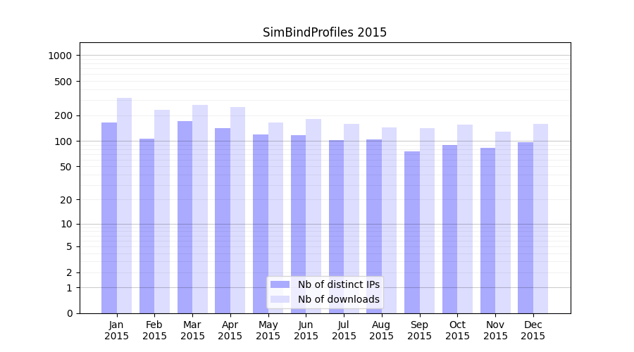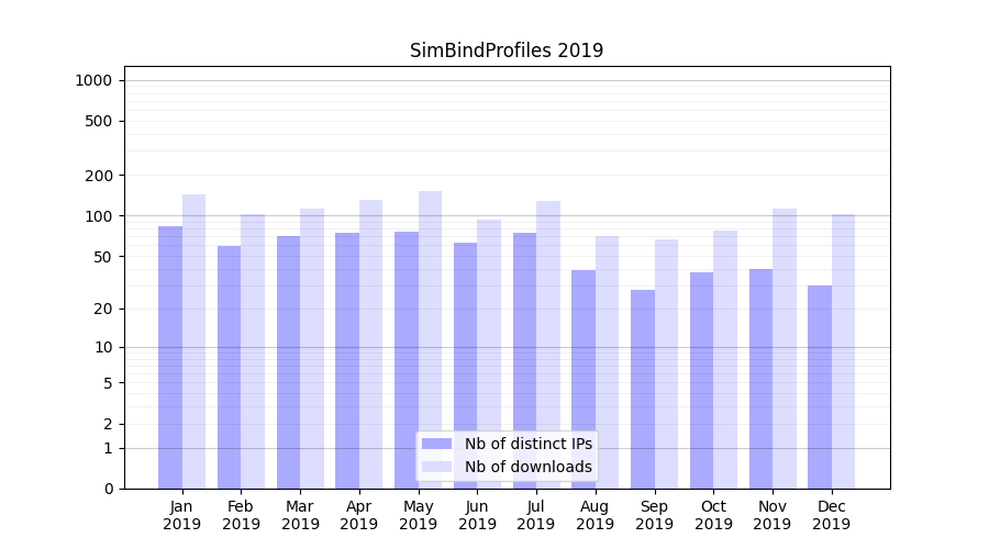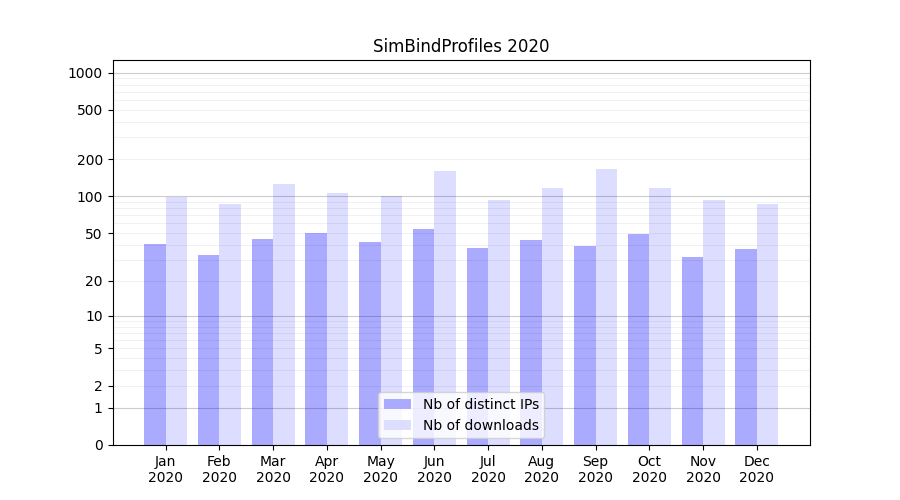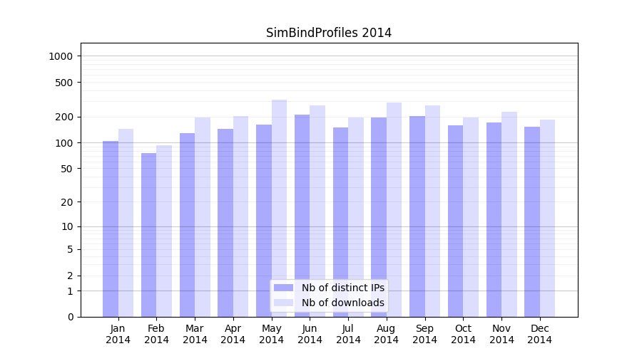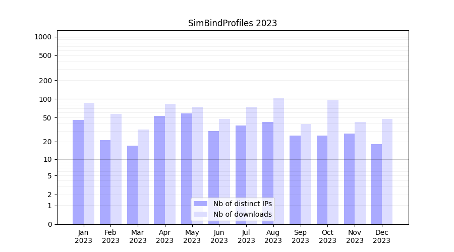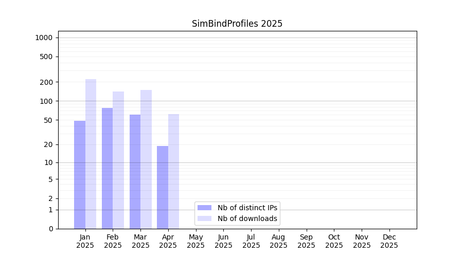 Number of downloads for software package SimBindProfiles, year by year, from 2025 back to 2014 (years with no downloads are omitted):