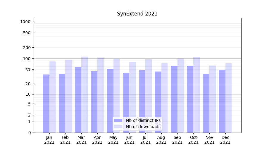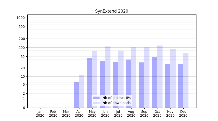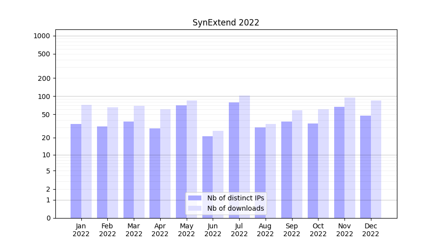 Number of downloads for software package SynExtend, year by year, from 2025 back to 2014 (years with no downloads are omitted):