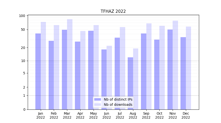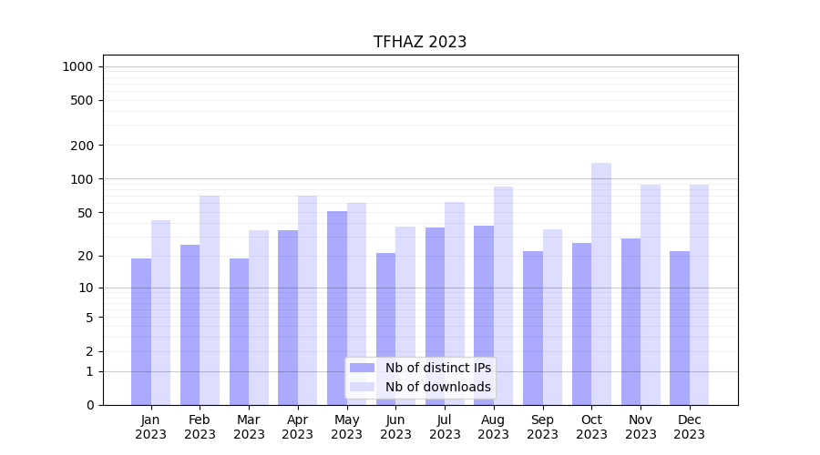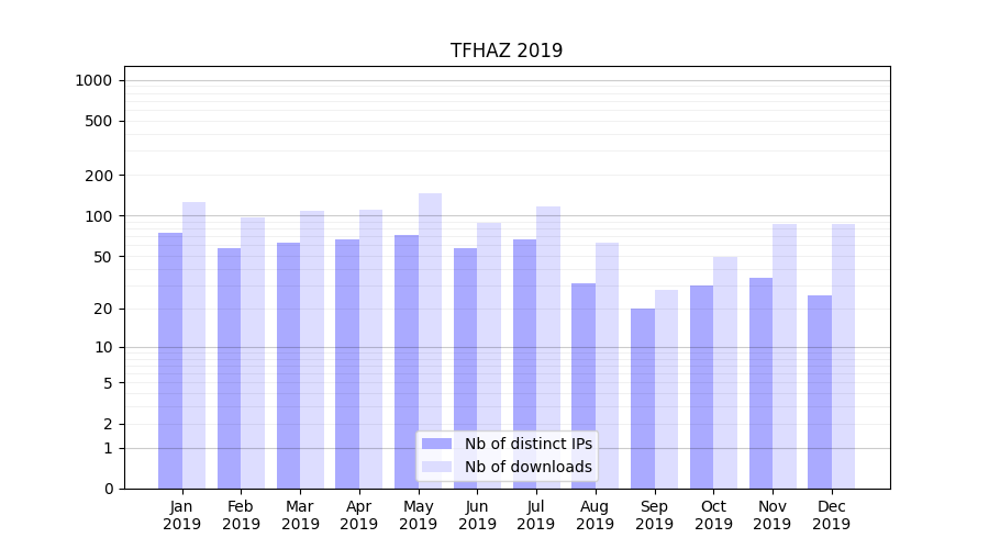 Number of downloads for software package TFHAZ, year by year, from 2025 back to 2014 (years with no downloads are omitted):