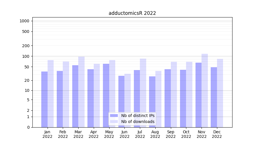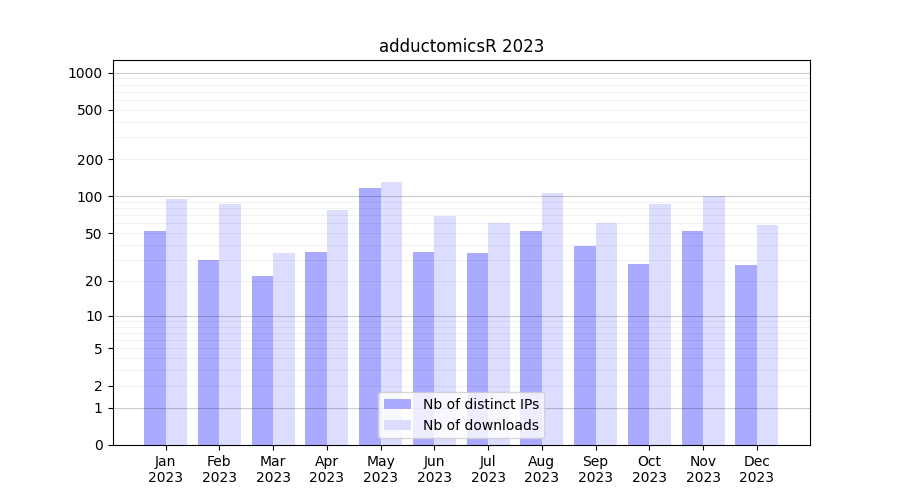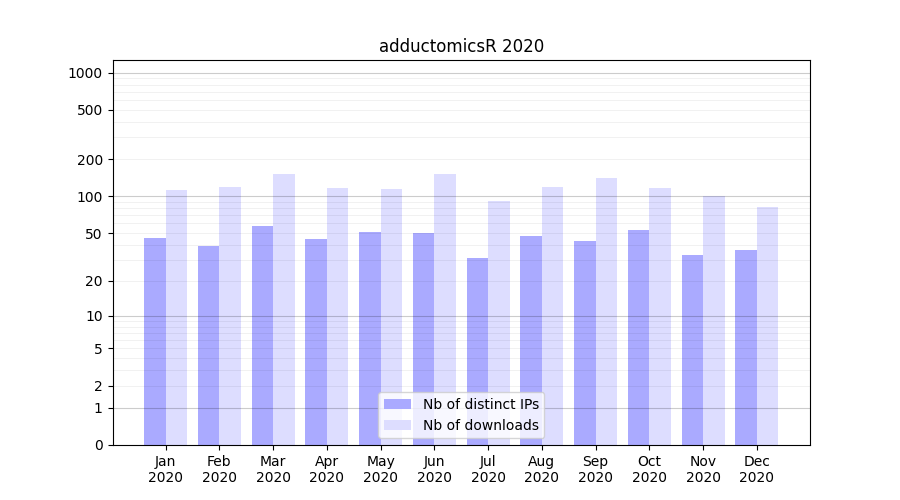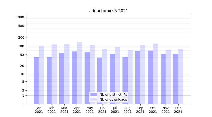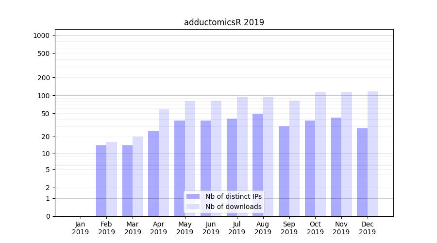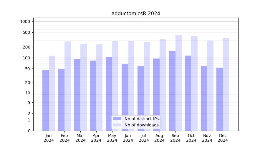 Number of downloads for software package adductomicsR, year by year, from 2025 back to 2014 (years with no downloads are omitted):