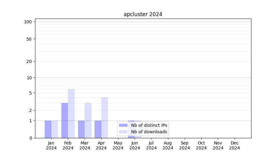 Number of downloads for software package apcluster, year by year, from 2025 back to 2014 (years with no downloads are omitted):