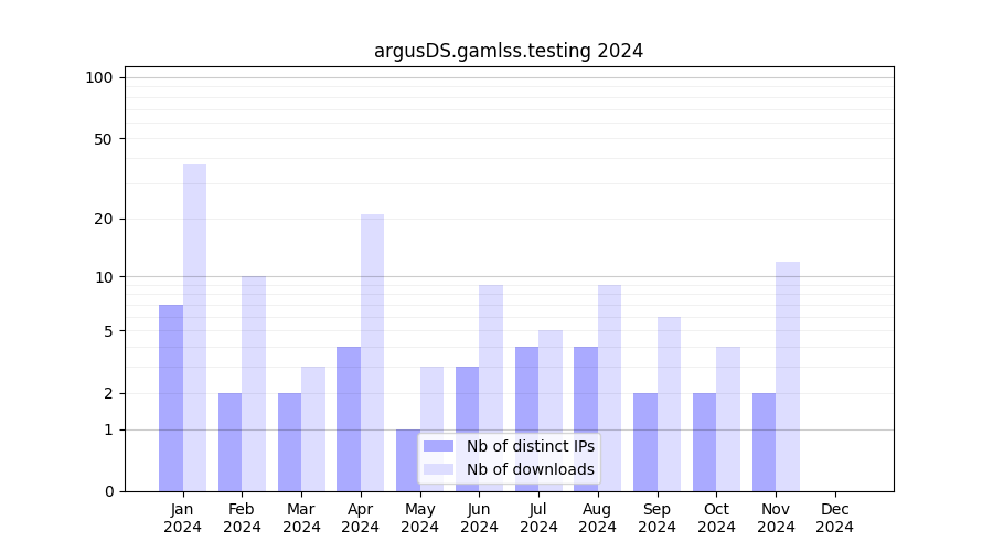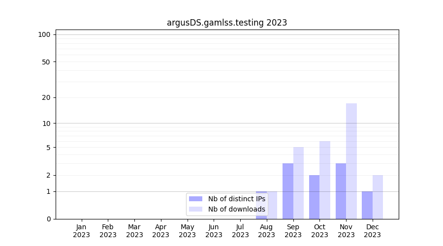 Number of downloads for software package argusDS.gamlss.testing, year by year, from 2025 back to 2014 (years with no downloads are omitted):