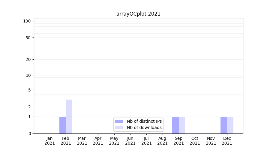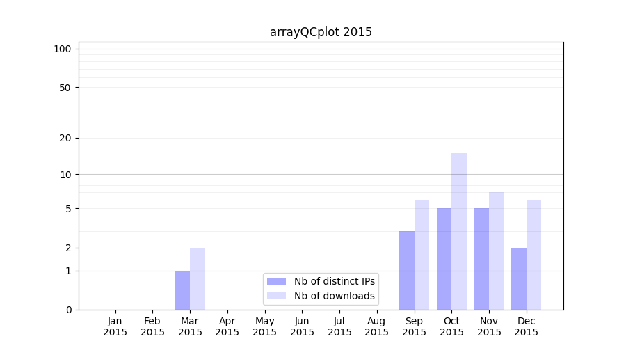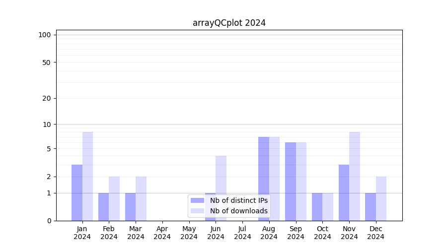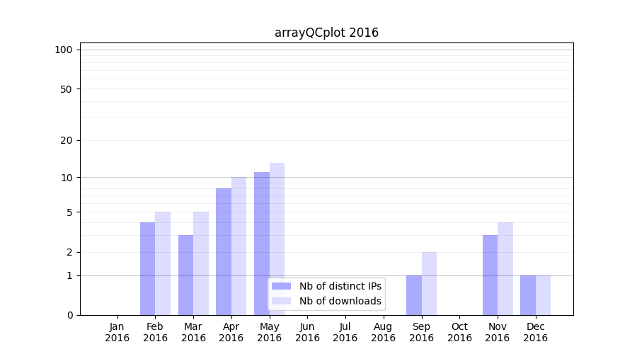 Number of downloads for software package arrayQCplot, year by year, from 2025 back to 2014 (years with no downloads are omitted):
