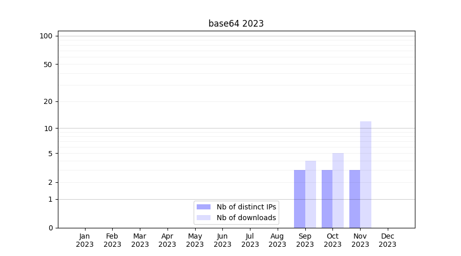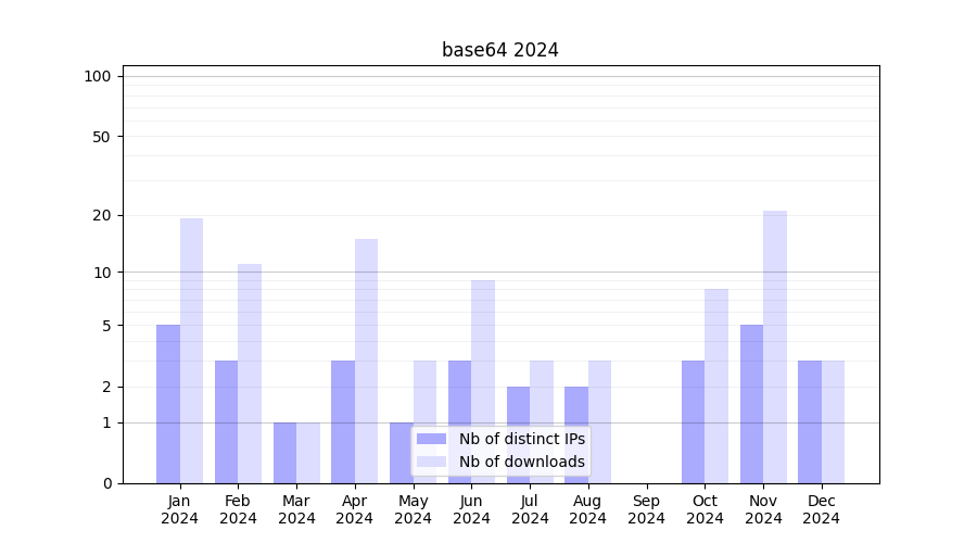 Number of downloads for software package base64, year by year, from 2025 back to 2014 (years with no downloads are omitted):