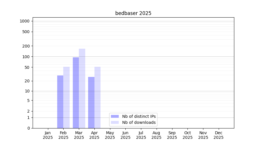 Number of downloads for software package bedbaser, year by year, from 2025 back to 2014 (years with no downloads are omitted):