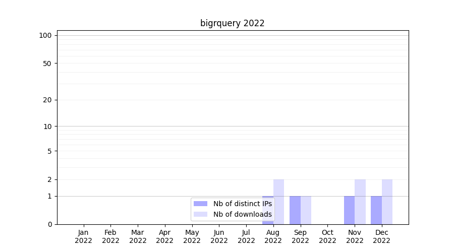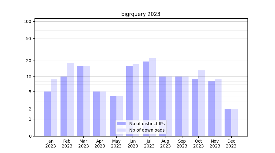 Number of downloads for software package bigrquery, year by year, from 2025 back to 2014 (years with no downloads are omitted):