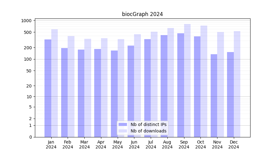 Number of downloads for software package biocGraph, year by year, from 2025 back to 2014 (years with no downloads are omitted):