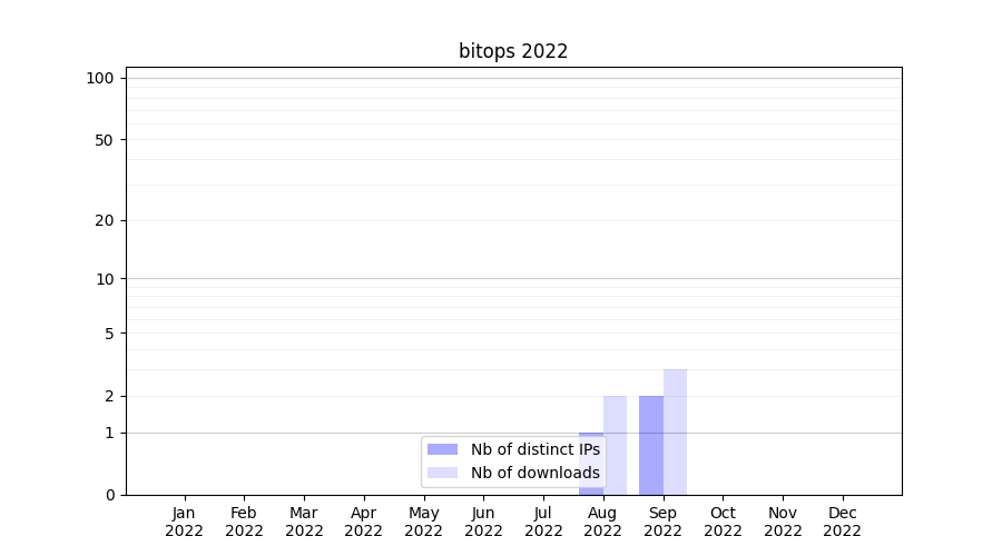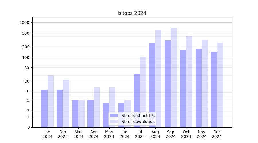 Number of downloads for software package bitops, year by year, from 2025 back to 2014 (years with no downloads are omitted):
