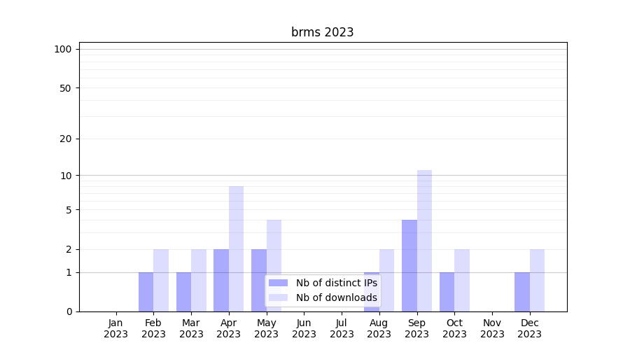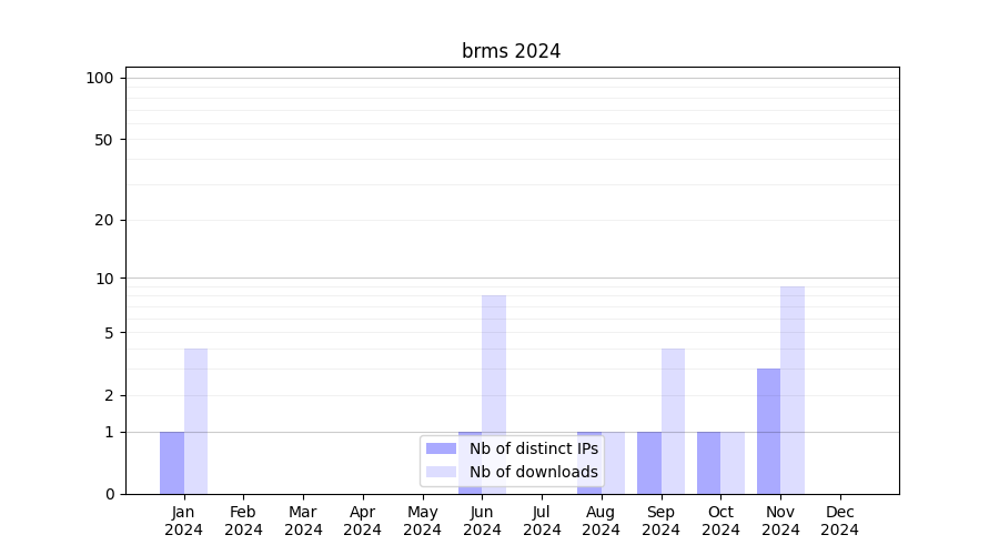 Number of downloads for software package brms, year by year, from 2025 back to 2014 (years with no downloads are omitted):