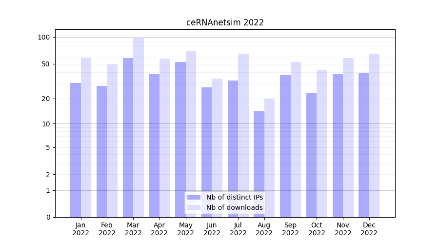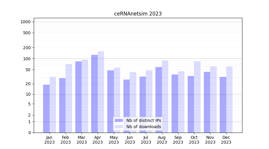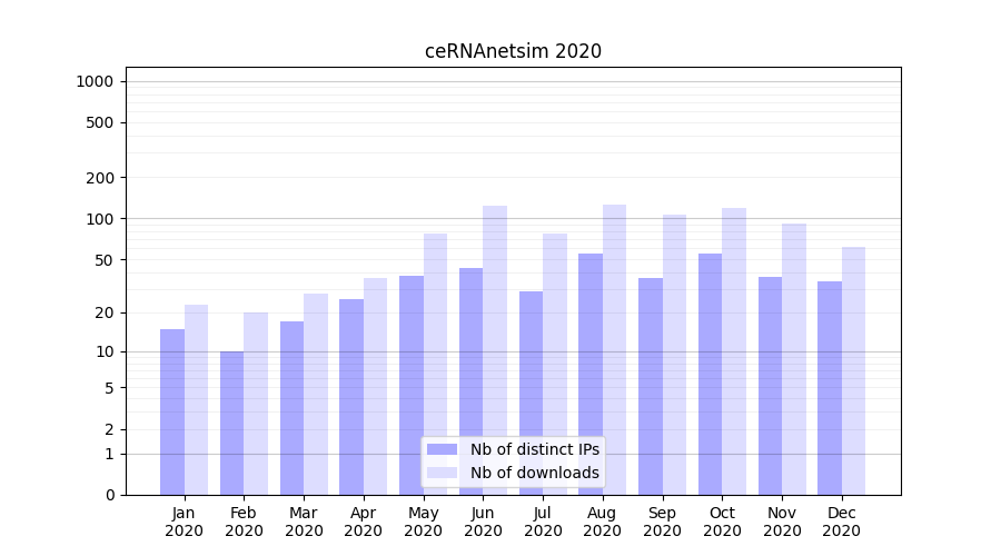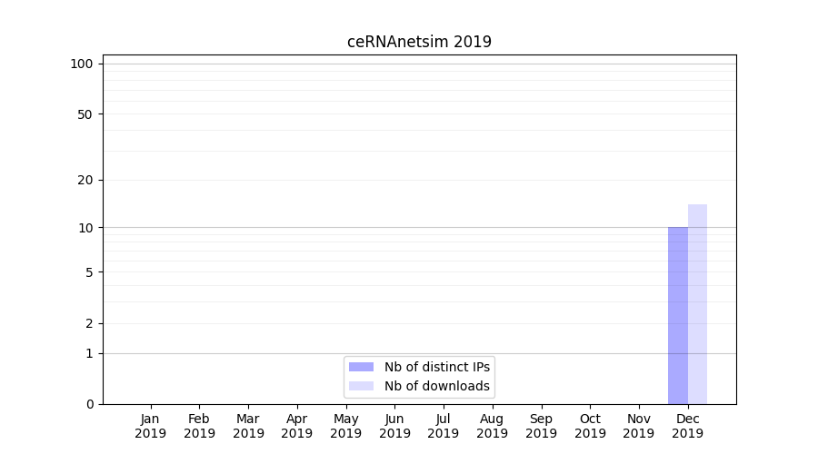 Number of downloads for software package ceRNAnetsim, year by year, from 2025 back to 2014 (years with no downloads are omitted):