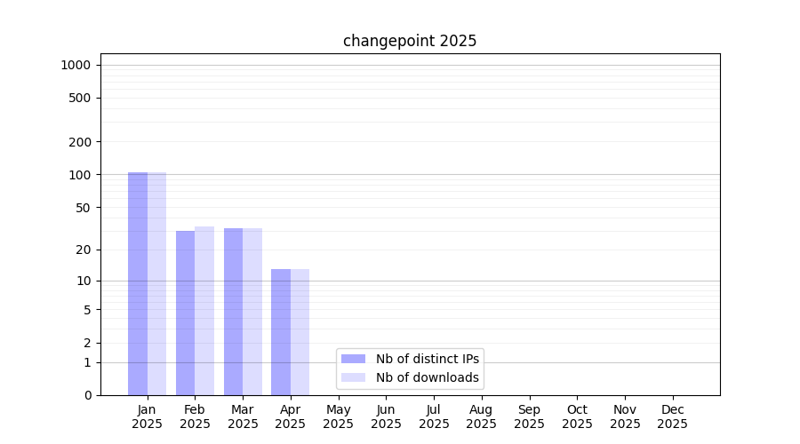Number of downloads for software package changepoint, year by year, from 2025 back to 2014 (years with no downloads are omitted):
