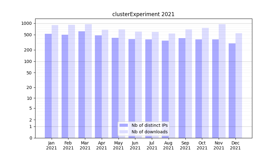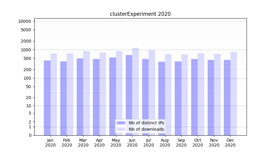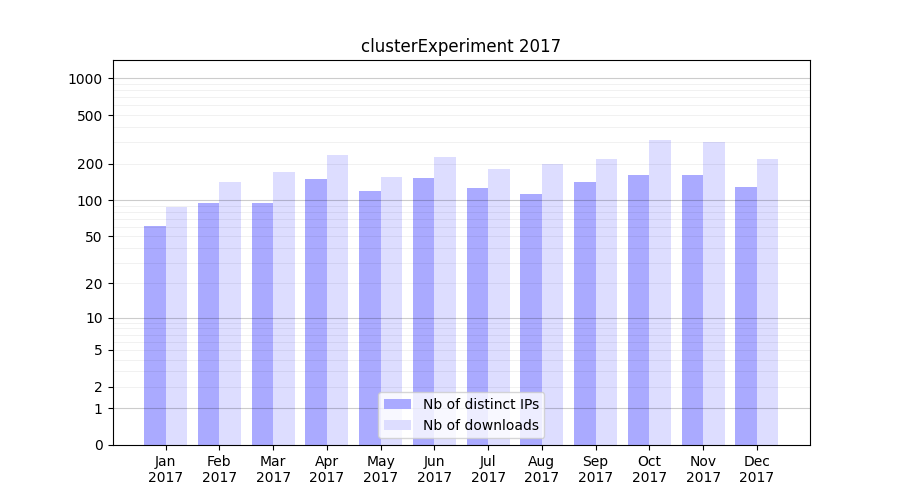 Number of downloads for software package clusterExperiment, year by year, from 2025 back to 2014 (years with no downloads are omitted):