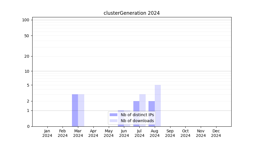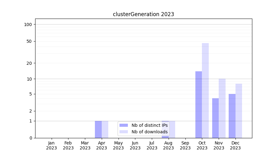 Number of downloads for software package clusterGeneration, year by year, from 2025 back to 2014 (years with no downloads are omitted):