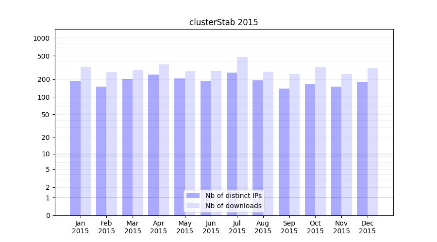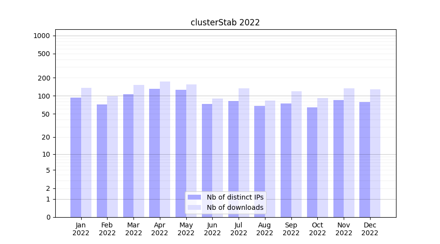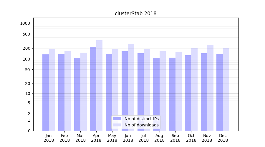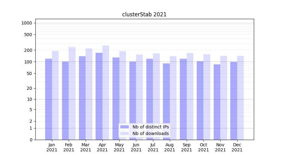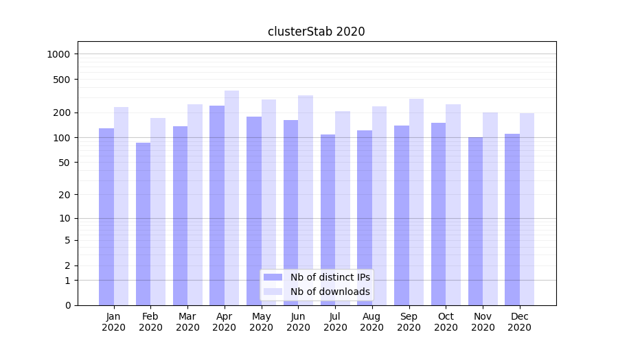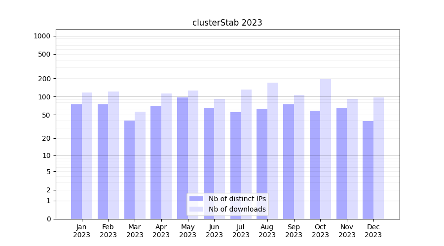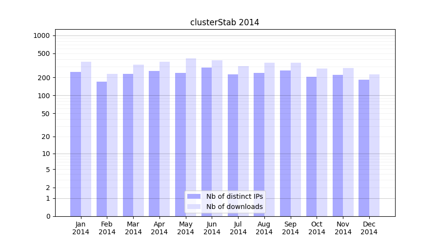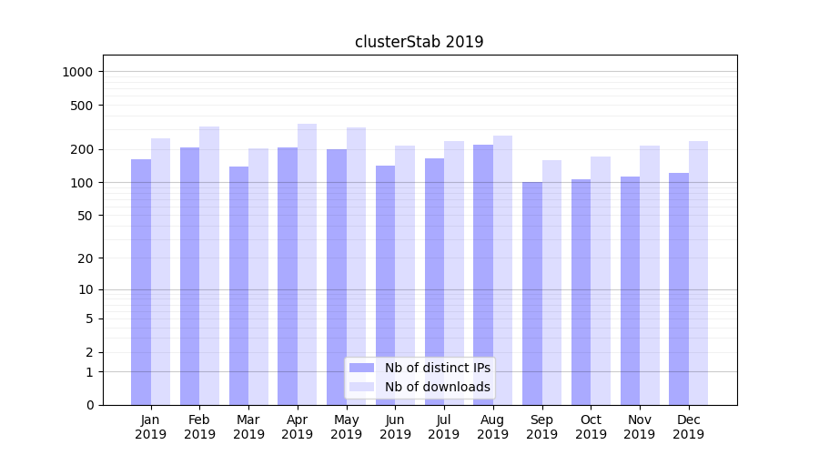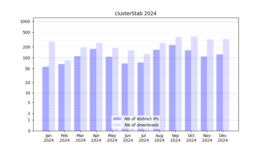 Number of downloads for software package clusterStab, year by year, from 2025 back to 2014 (years with no downloads are omitted):