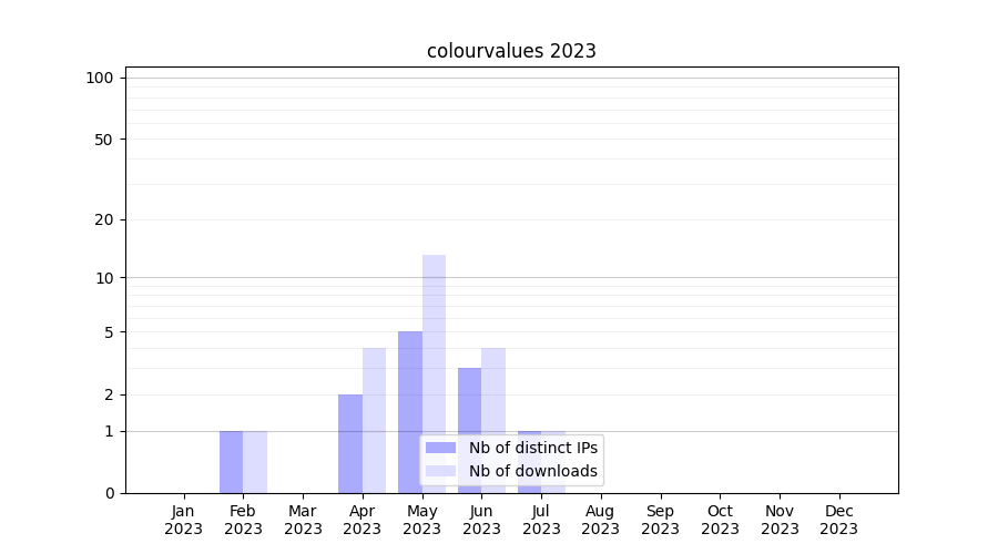 Number of downloads for software package colourvalues, year by year, from 2025 back to 2014 (years with no downloads are omitted):