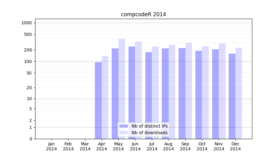 Number of downloads for software package compcodeR, year by year, from 2025 back to 2014 (years with no downloads are omitted):