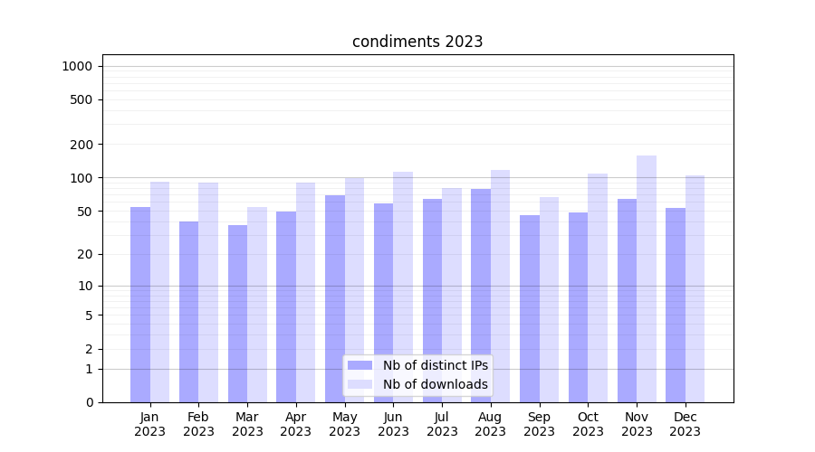 Number of downloads for software package condiments, year by year, from 2025 back to 2014 (years with no downloads are omitted):