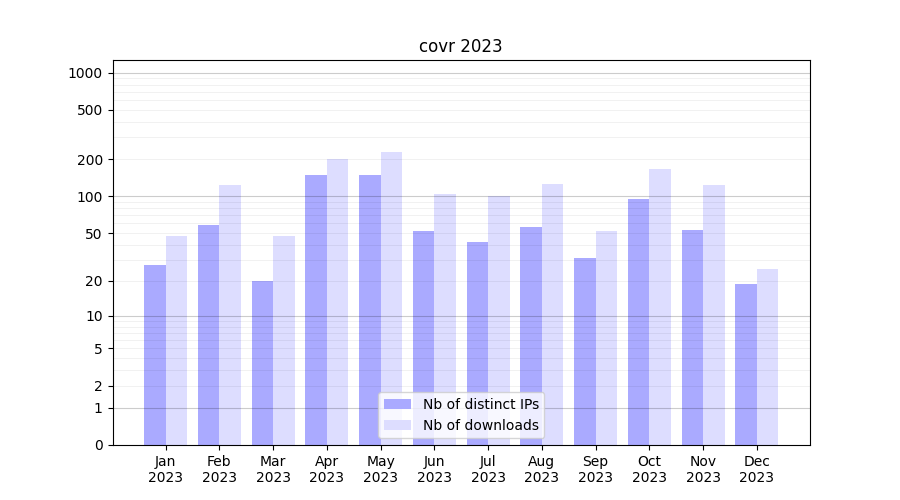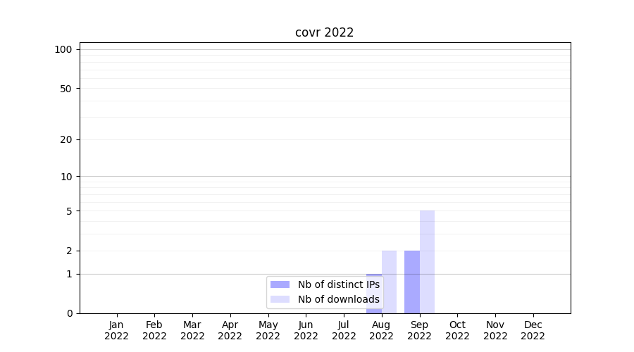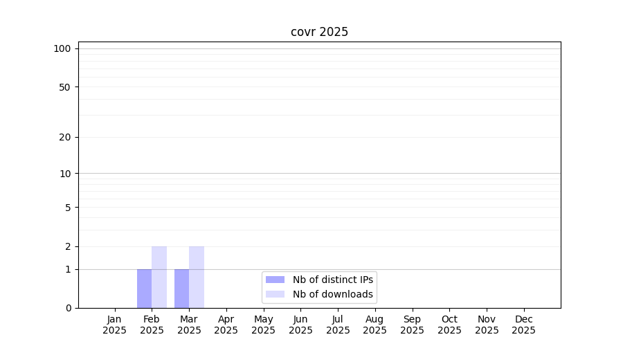Number of downloads for software package covr, year by year, from 2025 back to 2014 (years with no downloads are omitted):