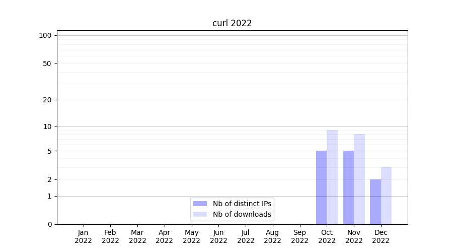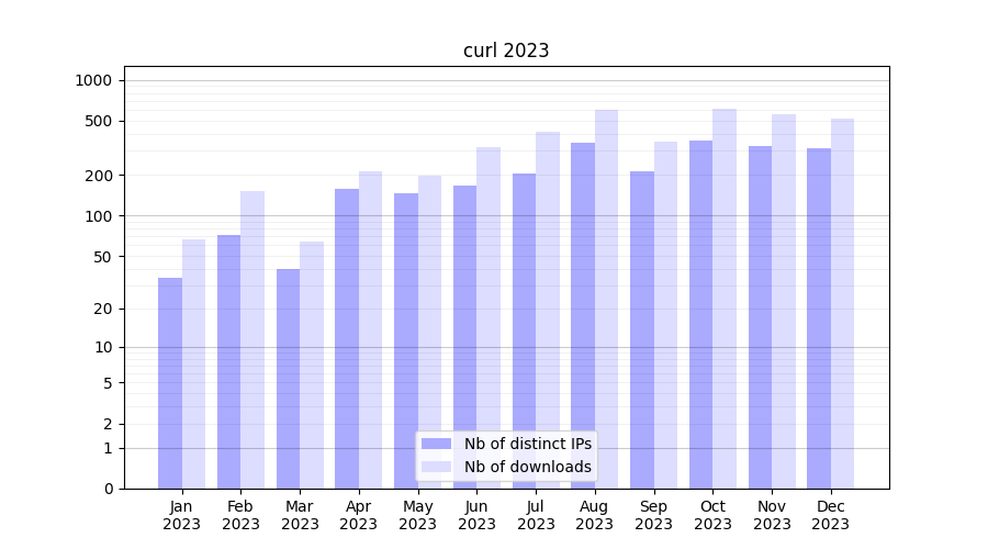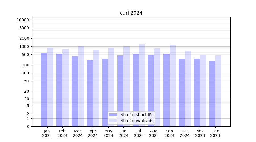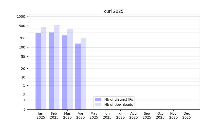 Number of downloads for software package curl, year by year, from 2025 back to 2014 (years with no downloads are omitted):
