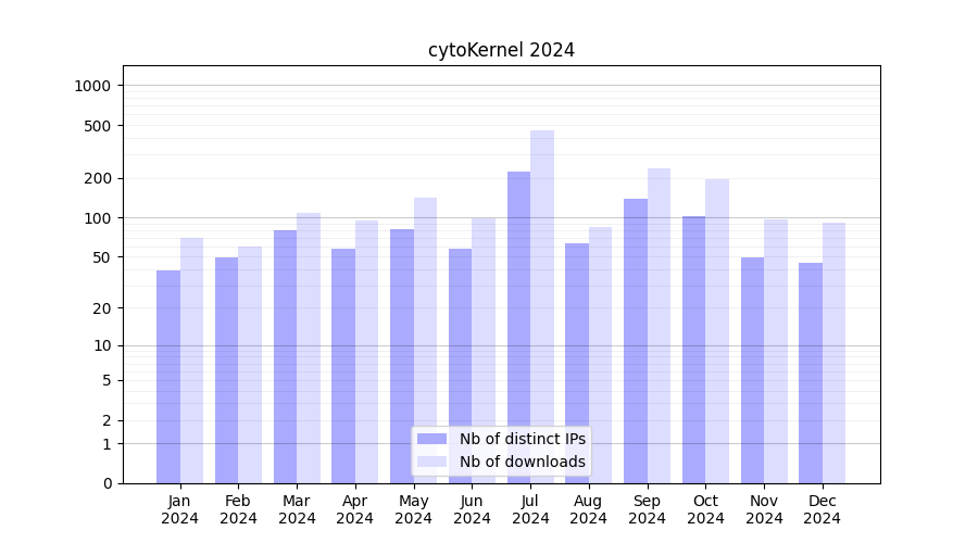 Number of downloads for software package cytoKernel, year by year, from 2025 back to 2014 (years with no downloads are omitted):