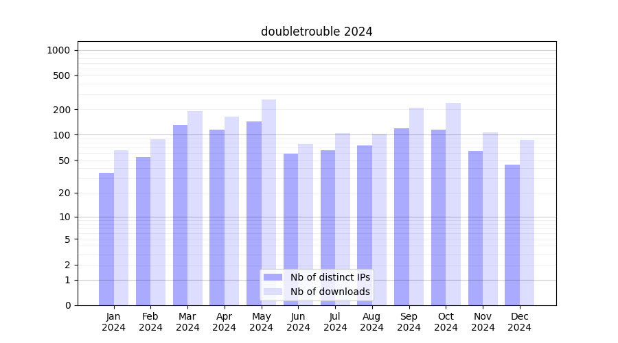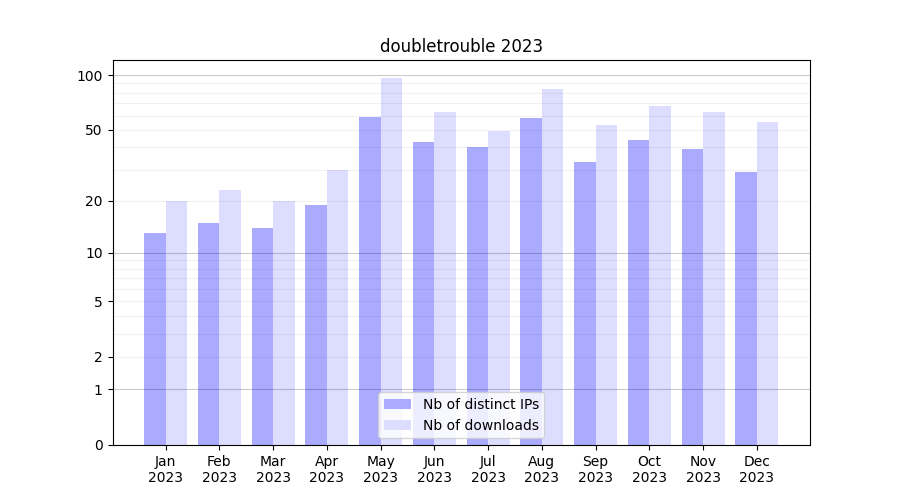 Number of downloads for software package doubletrouble, year by year, from 2025 back to 2014 (years with no downloads are omitted):