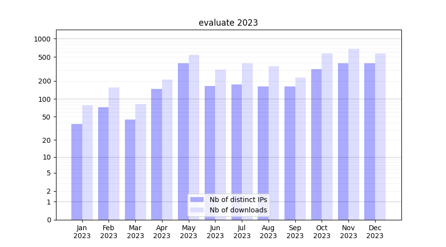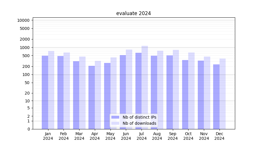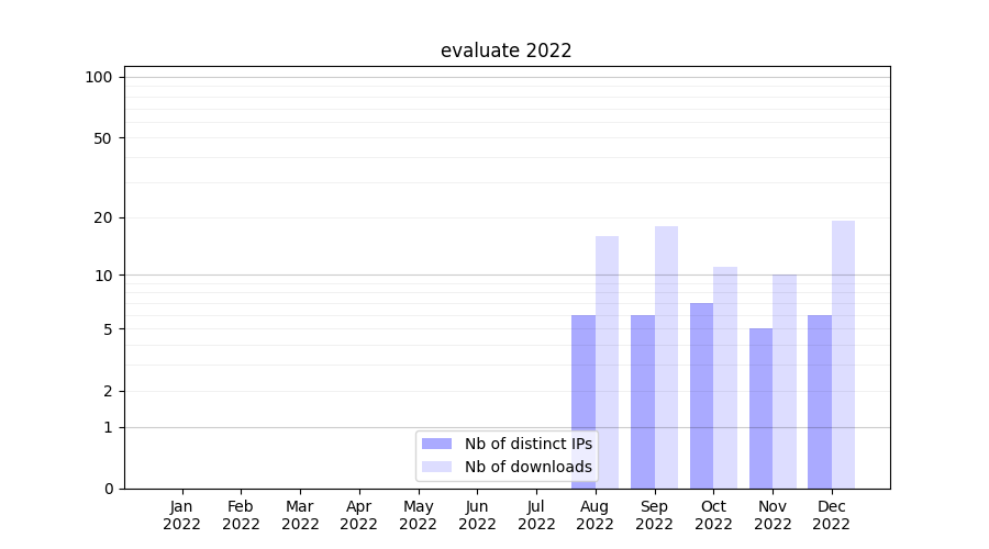 Number of downloads for software package evaluate, year by year, from 2025 back to 2014 (years with no downloads are omitted):