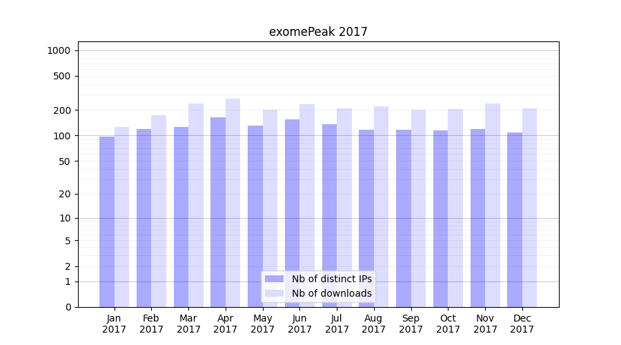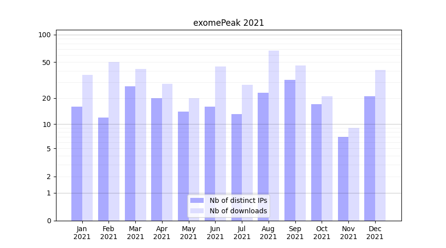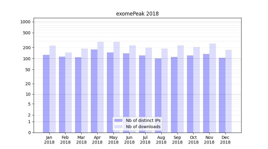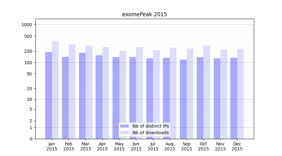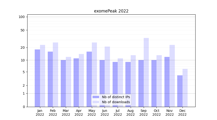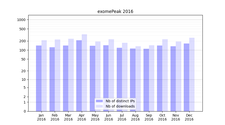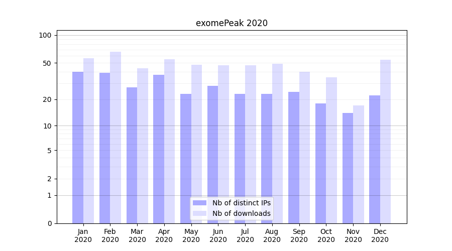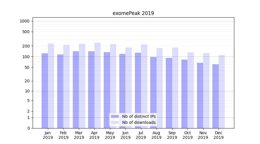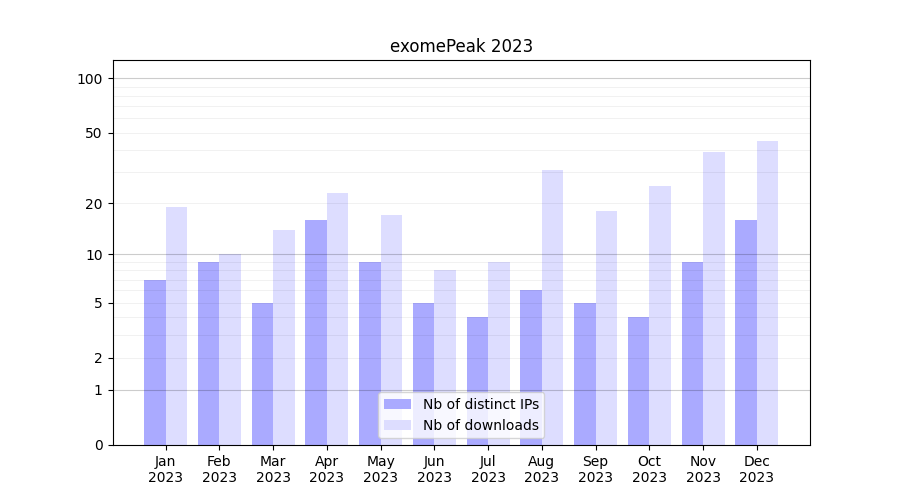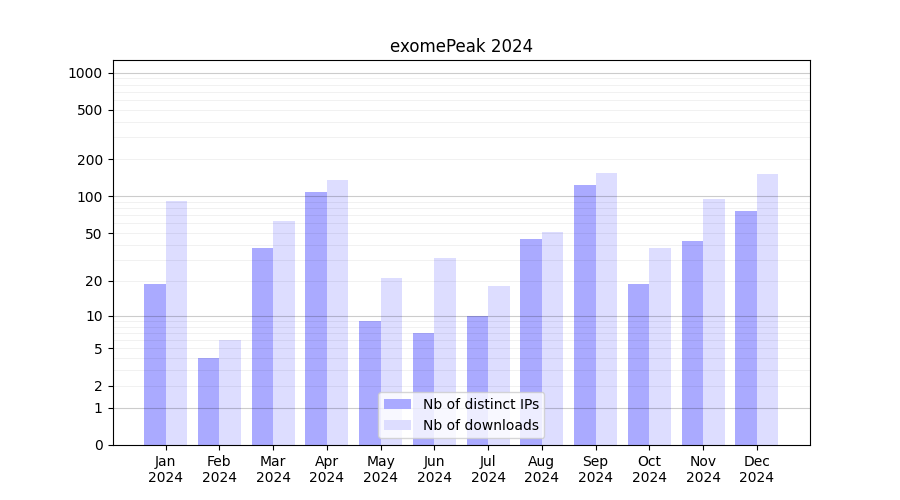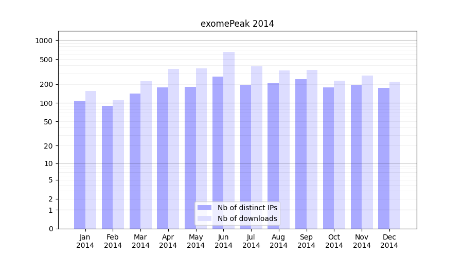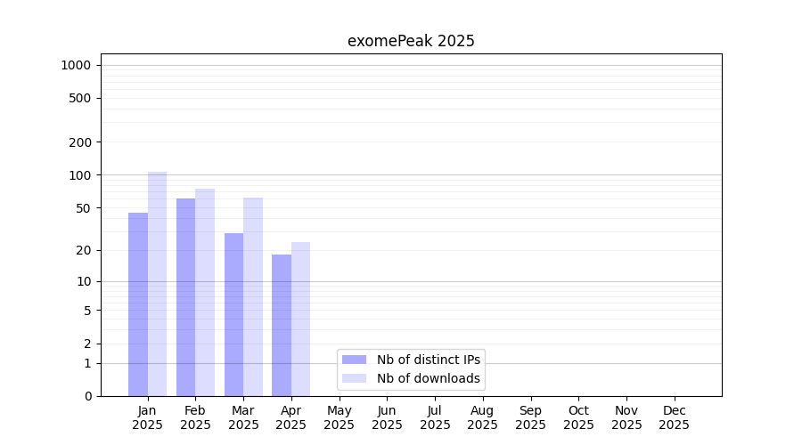 Number of downloads for software package exomePeak, year by year, from 2025 back to 2014 (years with no downloads are omitted):