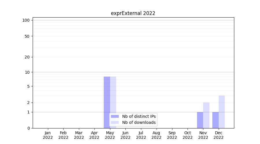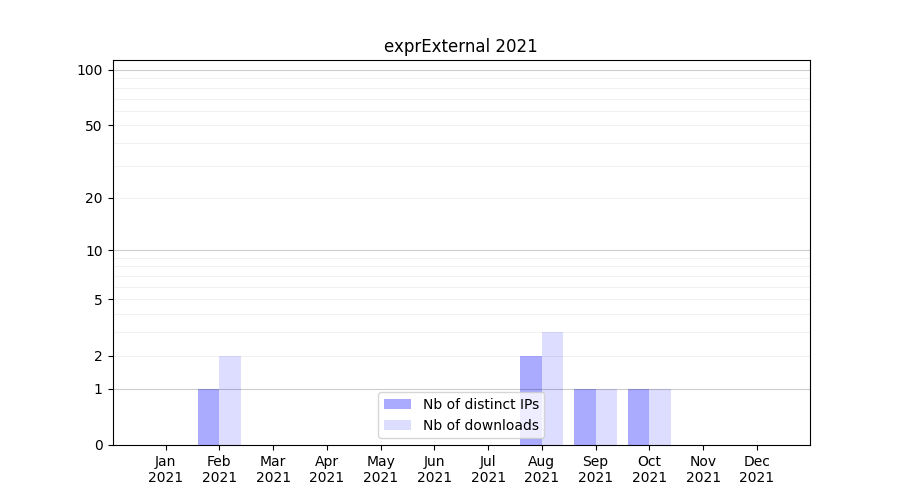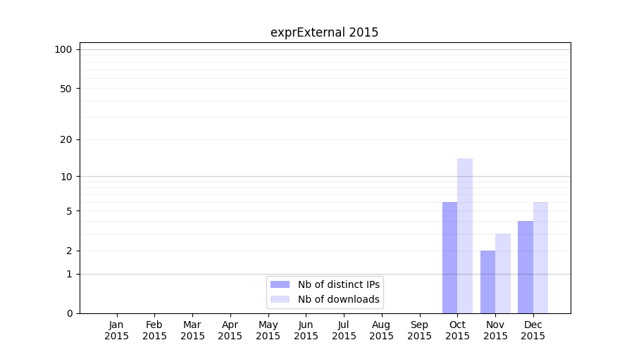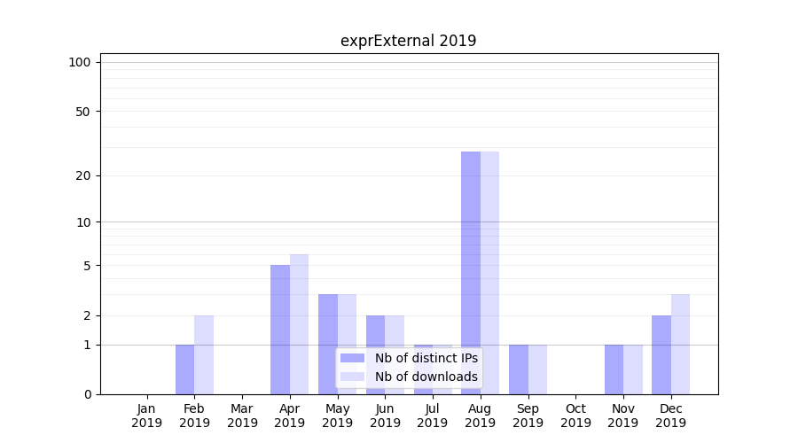 Number of downloads for software package exprExternal, year by year, from 2025 back to 2014 (years with no downloads are omitted):