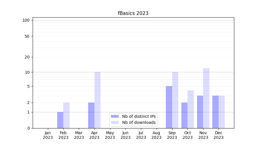 Number of downloads for software package fBasics, year by year, from 2025 back to 2014 (years with no downloads are omitted):