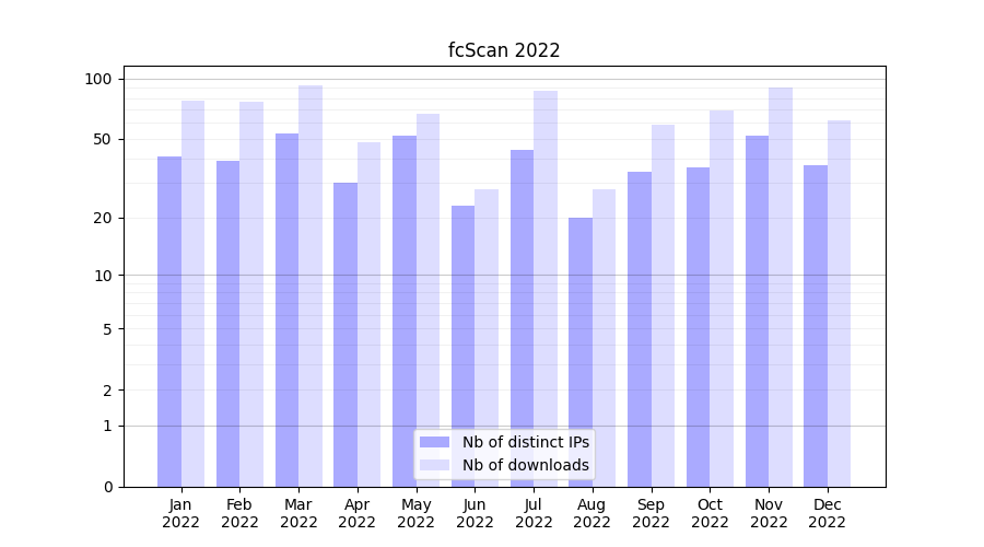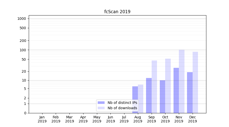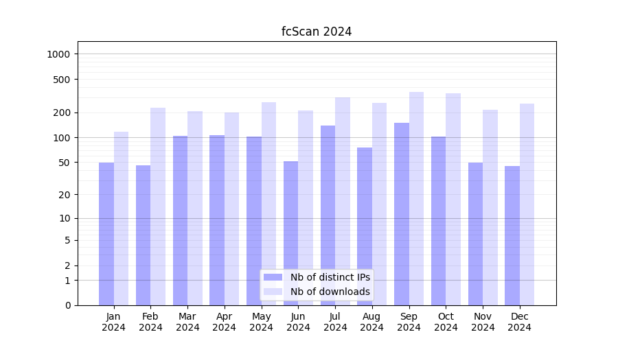 Number of downloads for software package fcScan, year by year, from 2025 back to 2014 (years with no downloads are omitted):