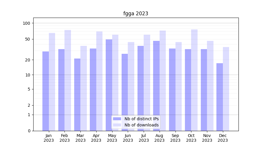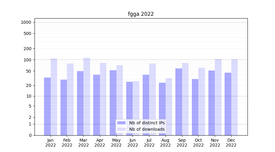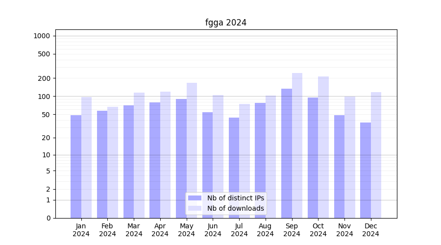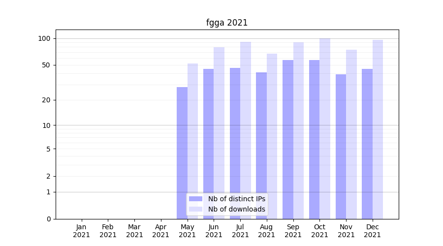 Number of downloads for software package fgga, year by year, from 2025 back to 2014 (years with no downloads are omitted):