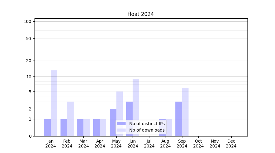 Number of downloads for software package float, year by year, from 2025 back to 2014 (years with no downloads are omitted):
