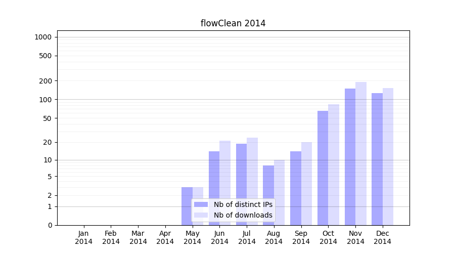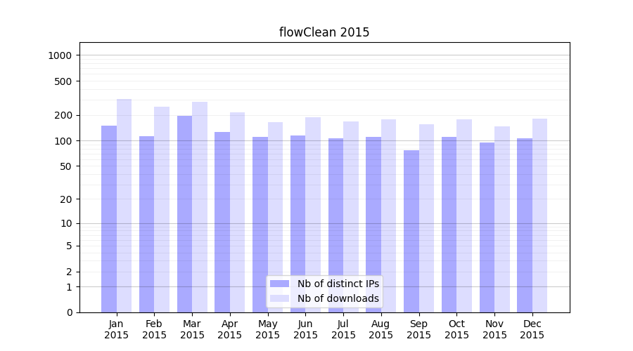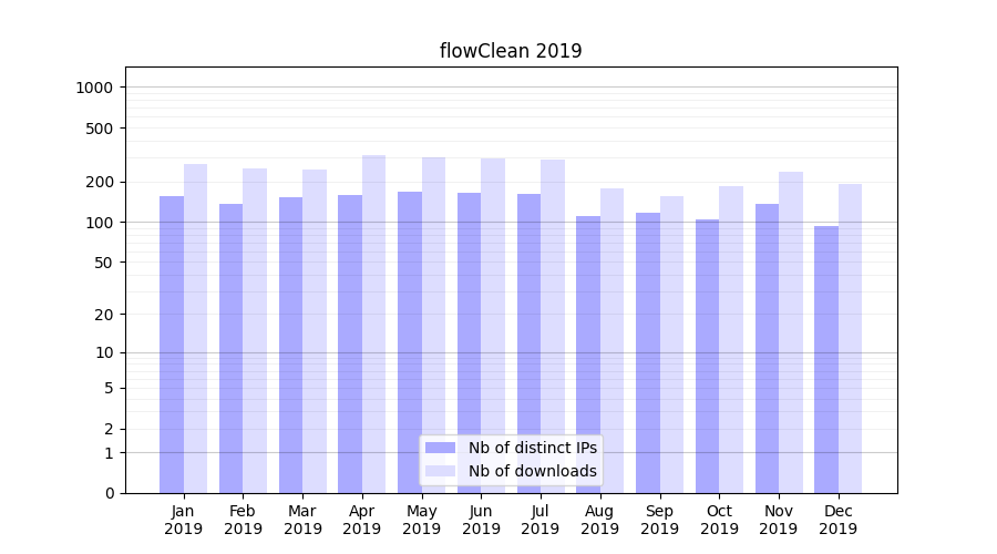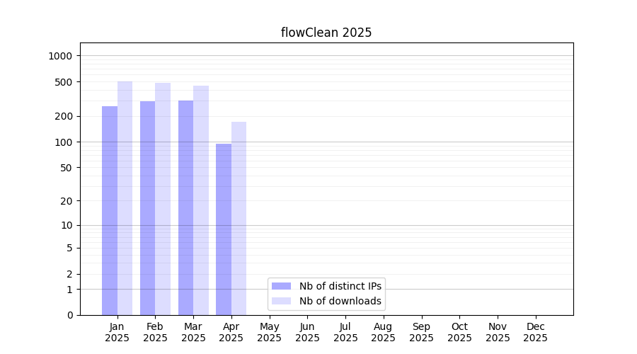 Number of downloads for software package flowClean, year by year, from 2025 back to 2014 (years with no downloads are omitted):