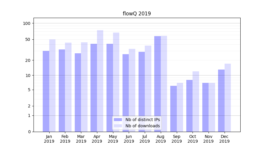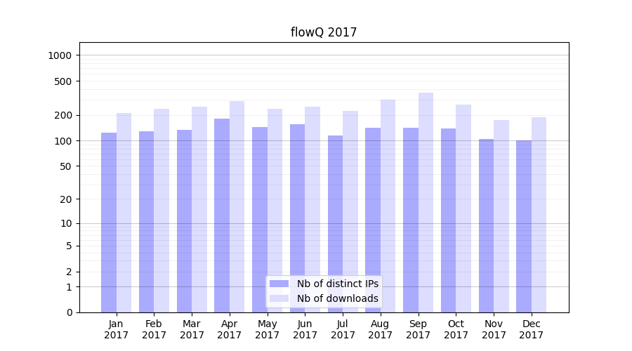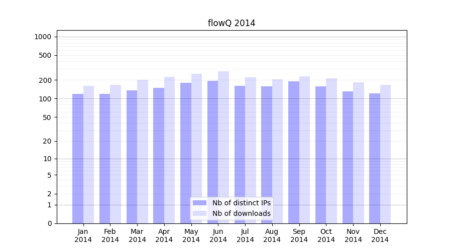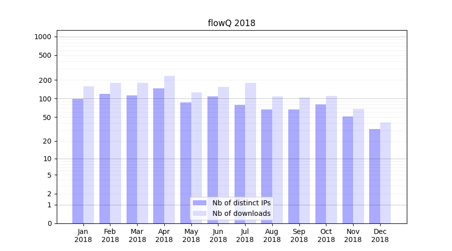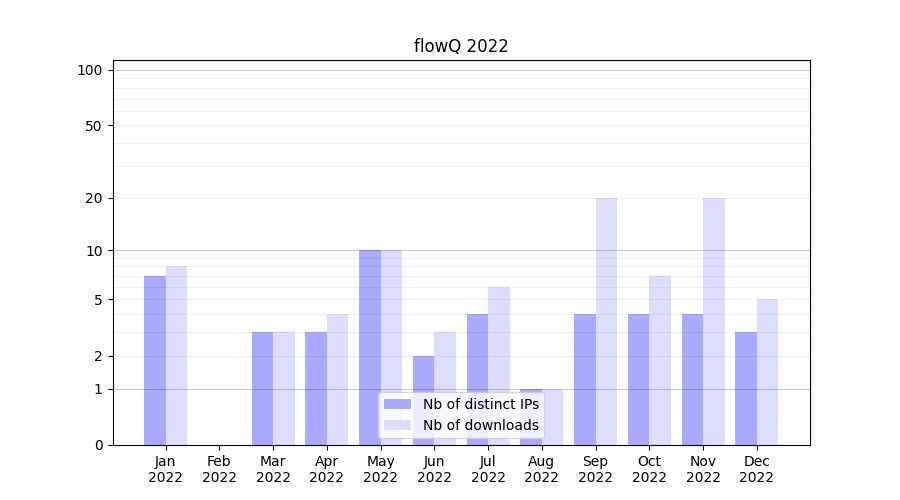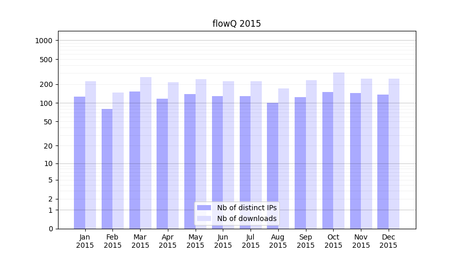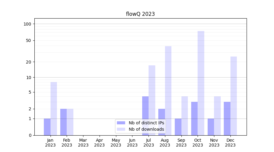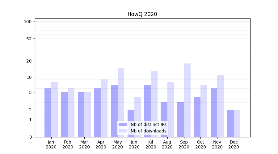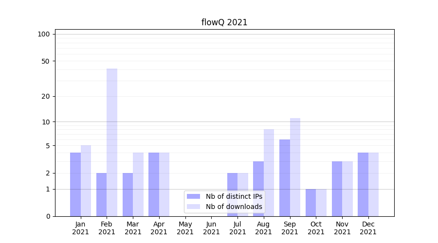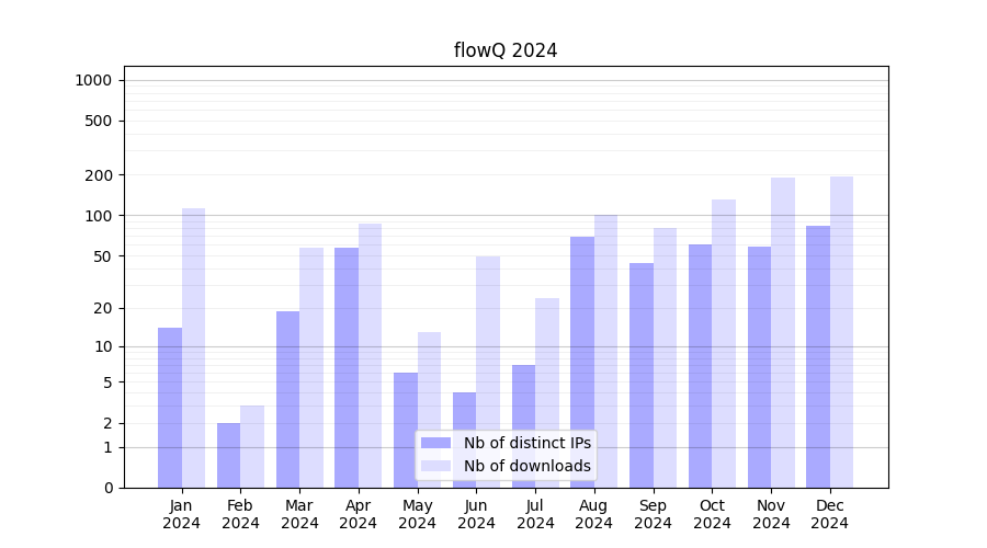 Number of downloads for software package flowQ, year by year, from 2025 back to 2014 (years with no downloads are omitted):