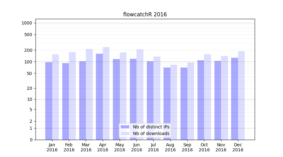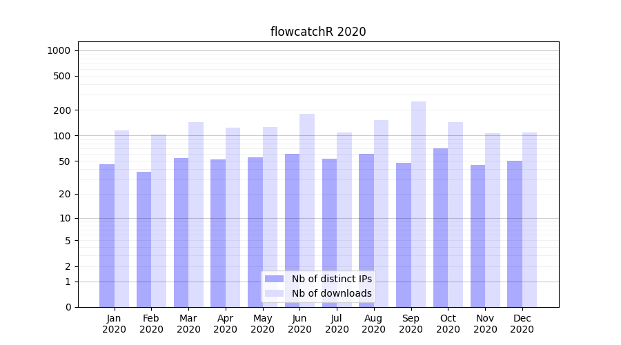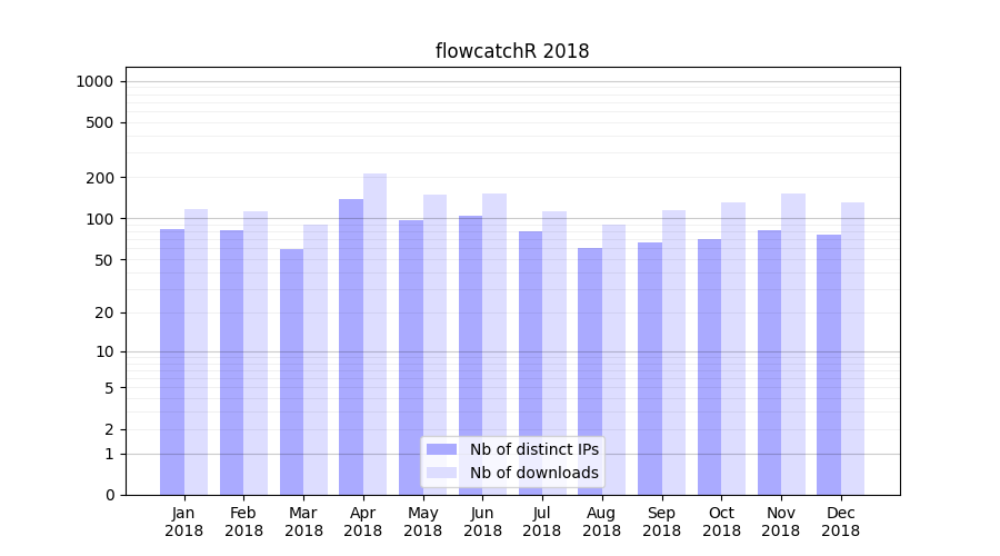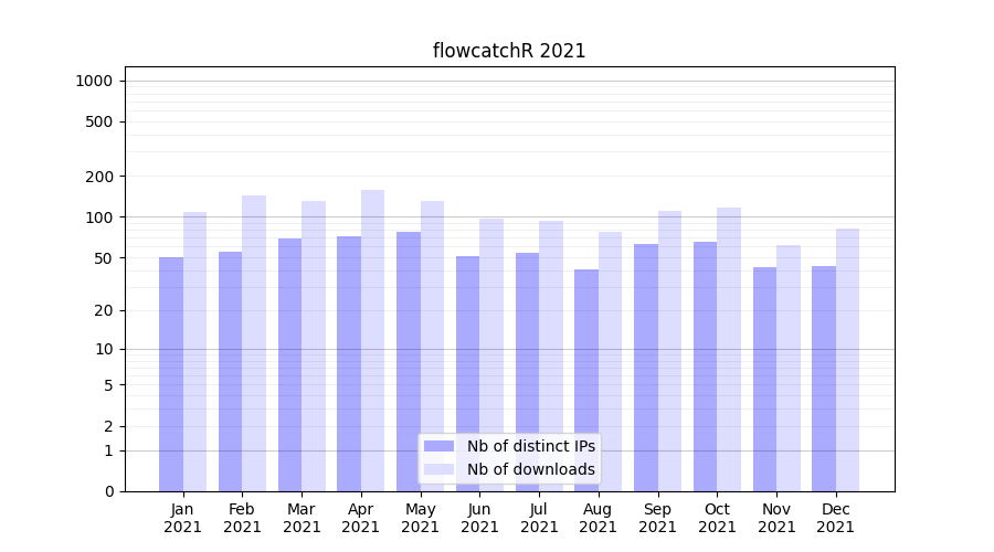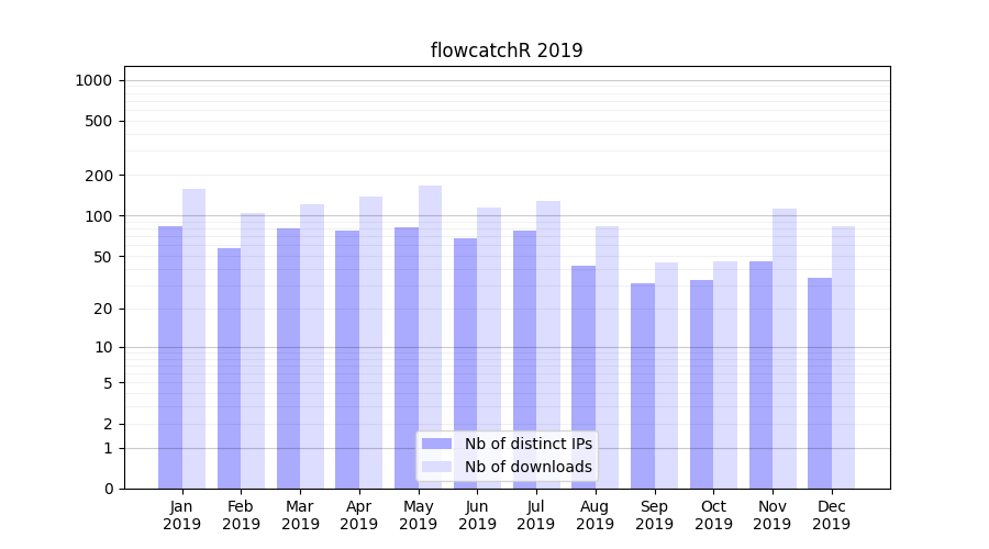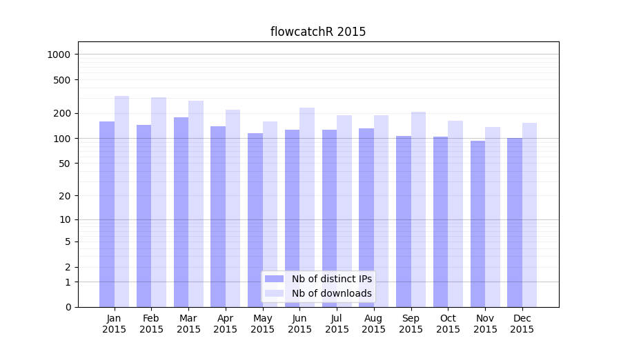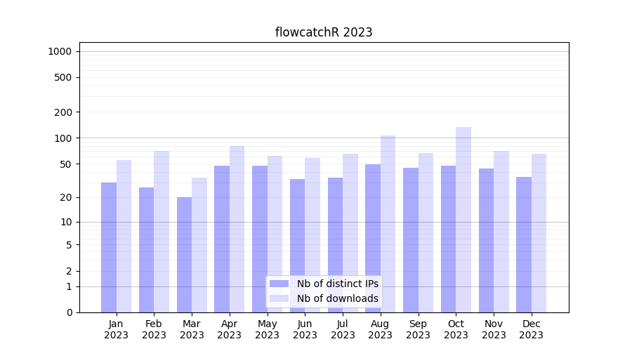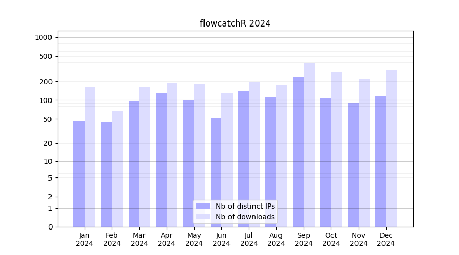 Number of downloads for software package flowcatchR, year by year, from 2025 back to 2014 (years with no downloads are omitted):