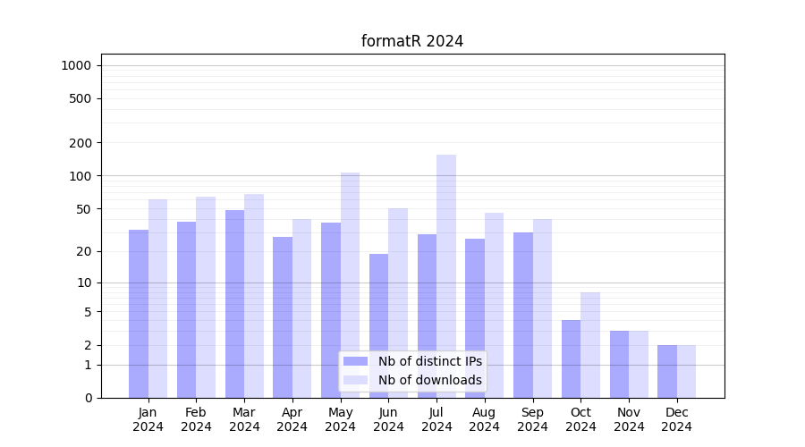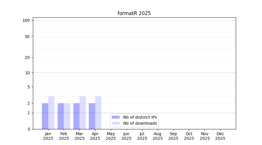 Number of downloads for software package formatR, year by year, from 2025 back to 2014 (years with no downloads are omitted):