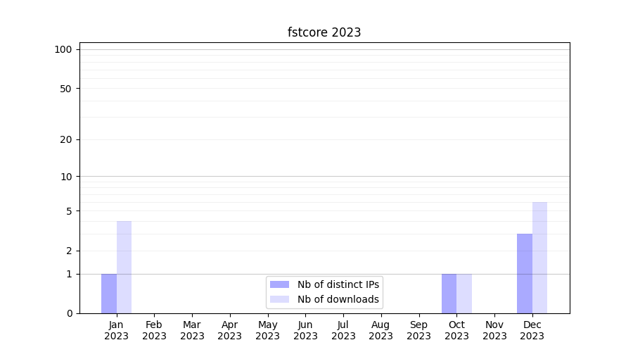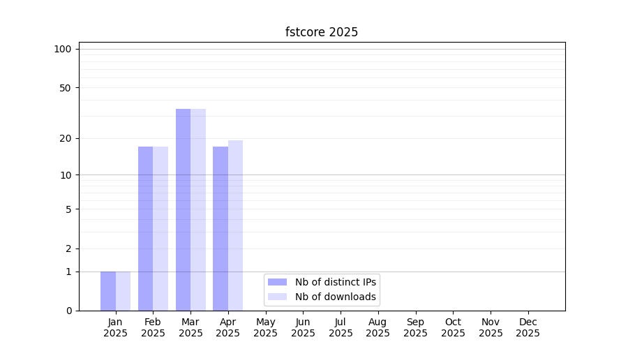 Number of downloads for software package fstcore, year by year, from 2025 back to 2014 (years with no downloads are omitted):
