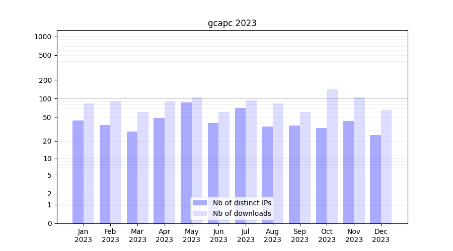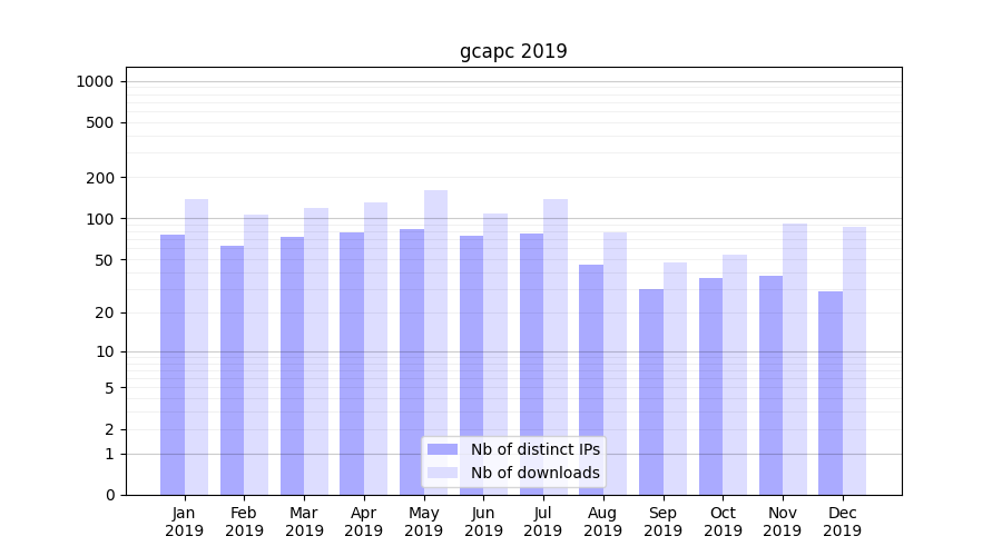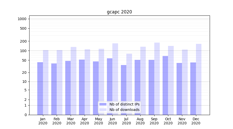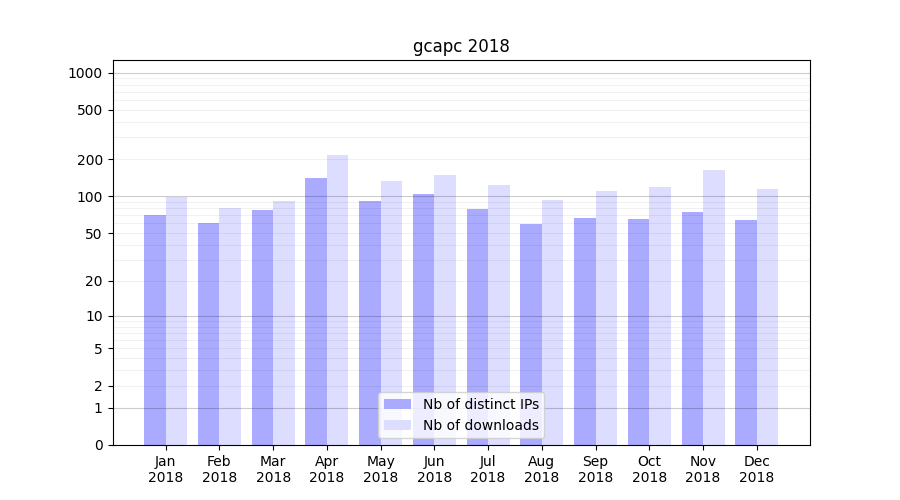 Number of downloads for software package gcapc, year by year, from 2025 back to 2014 (years with no downloads are omitted):