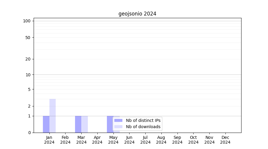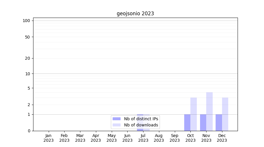 Number of downloads for software package geojsonio, year by year, from 2025 back to 2014 (years with no downloads are omitted):
