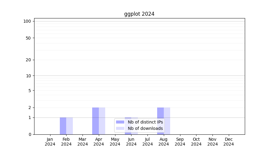 Number of downloads for software package ggplot, year by year, from 2025 back to 2014 (years with no downloads are omitted):