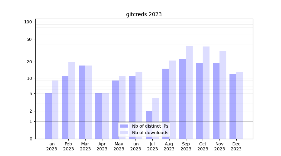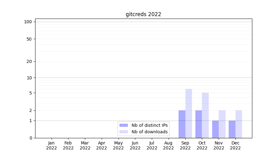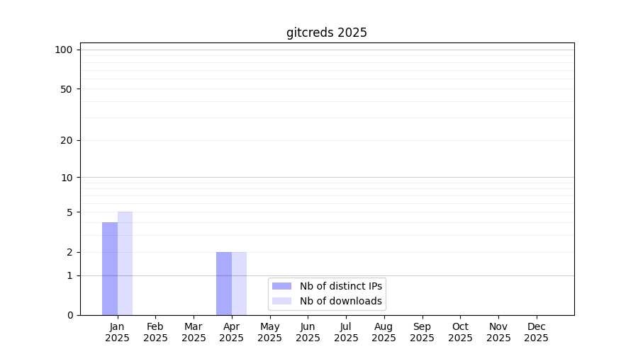 Number of downloads for software package gitcreds, year by year, from 2025 back to 2014 (years with no downloads are omitted):