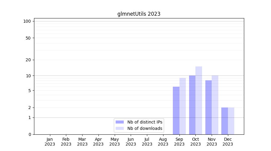 Number of downloads for software package glmnetUtils, year by year, from 2025 back to 2014 (years with no downloads are omitted):