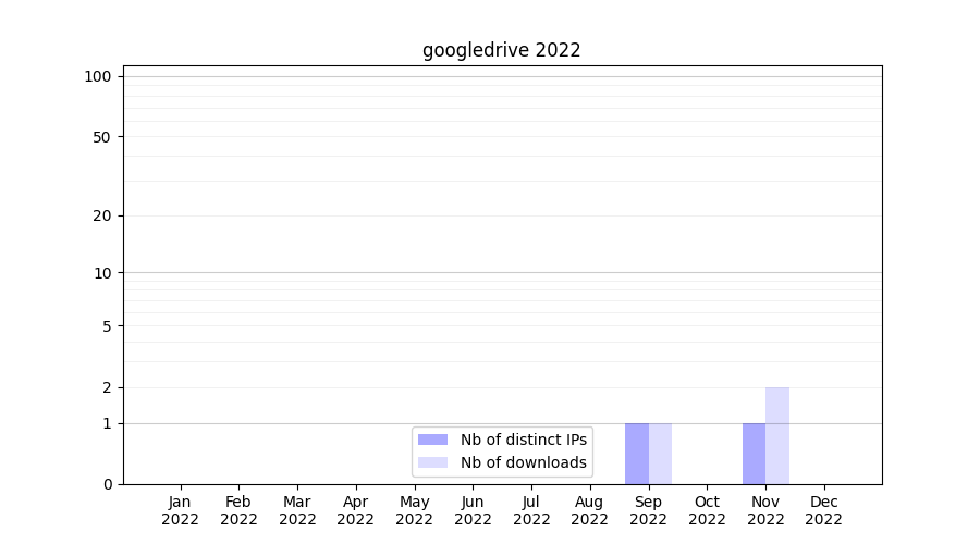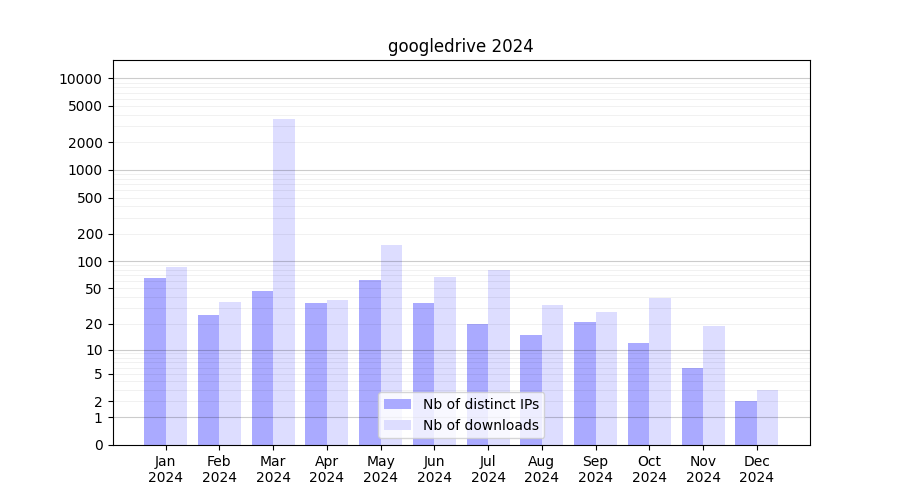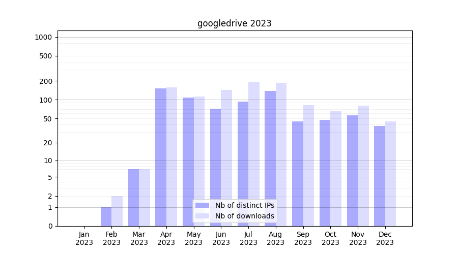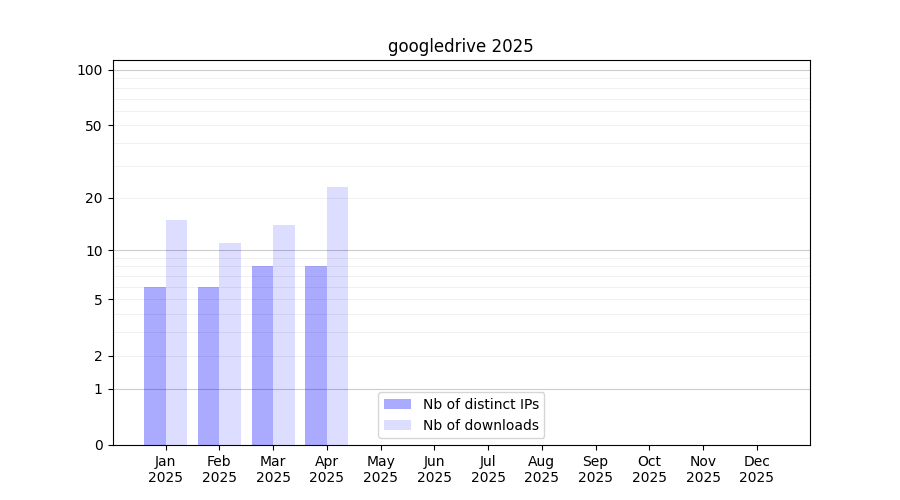 Number of downloads for software package googledrive, year by year, from 2025 back to 2014 (years with no downloads are omitted):