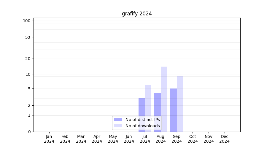 Number of downloads for software package grafify, year by year, from 2025 back to 2014 (years with no downloads are omitted):