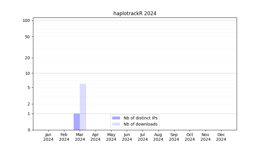 Number of downloads for software package haplotrackR, year by year, from 2025 back to 2014 (years with no downloads are omitted):